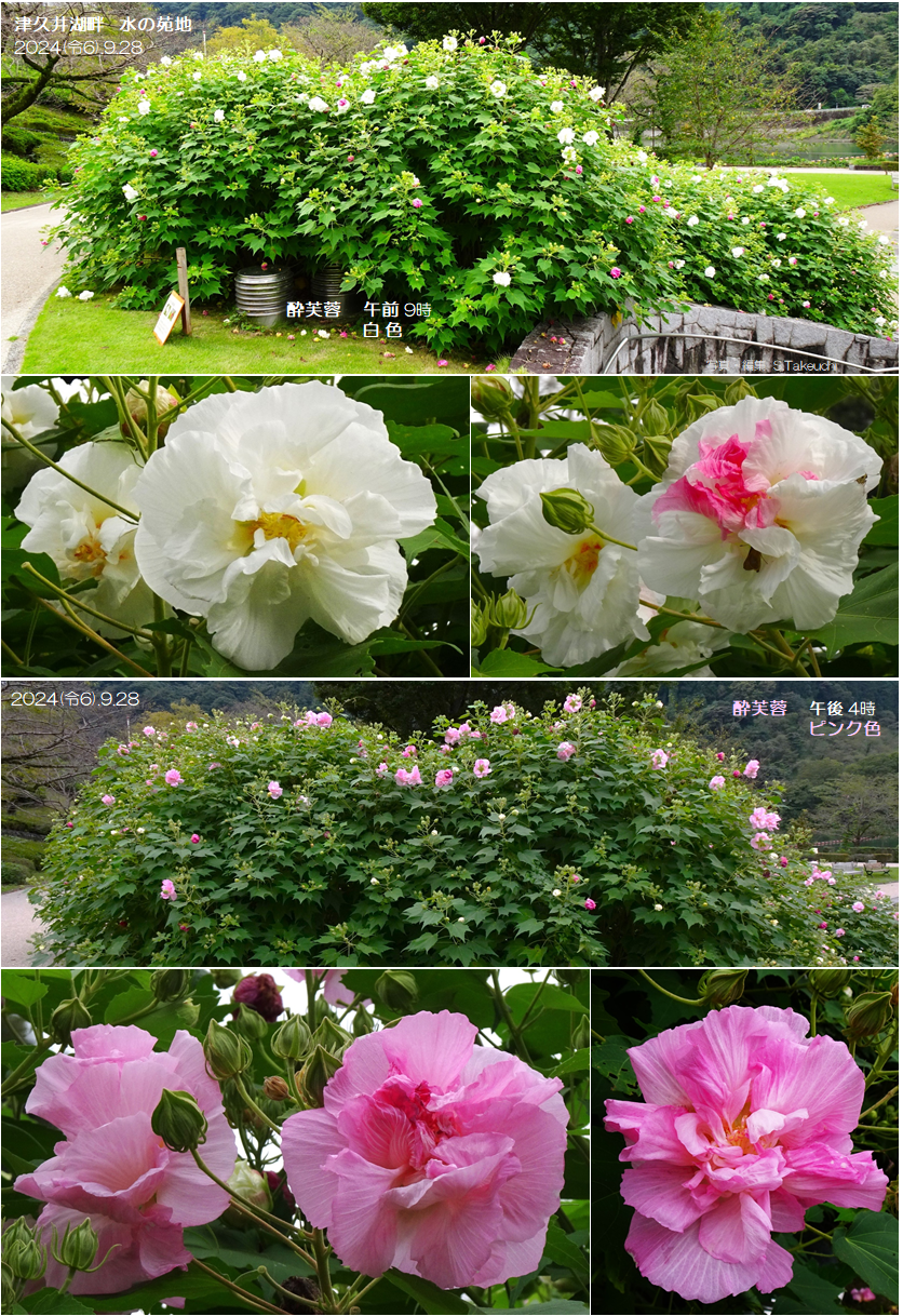 4.酔芙蓉は城山湖畔の東側「水の苑地」にあり、午前は白、午後はピンクと変わるので 何回も楽しんで来ました。