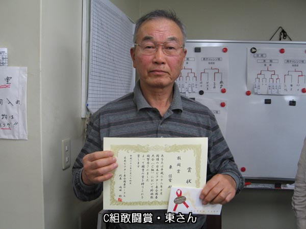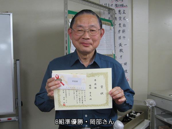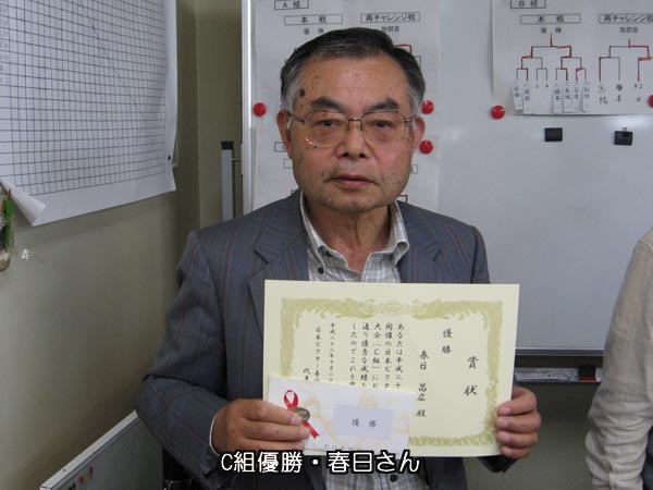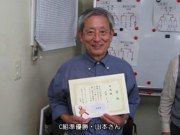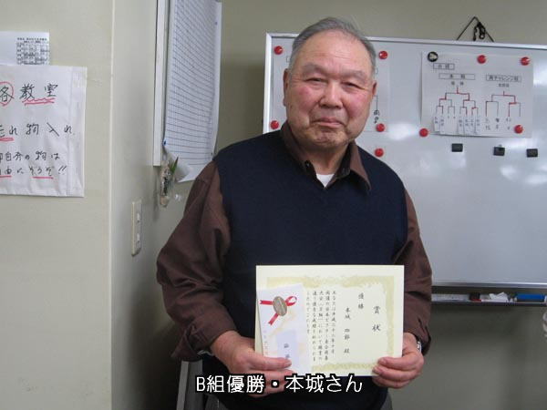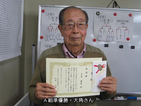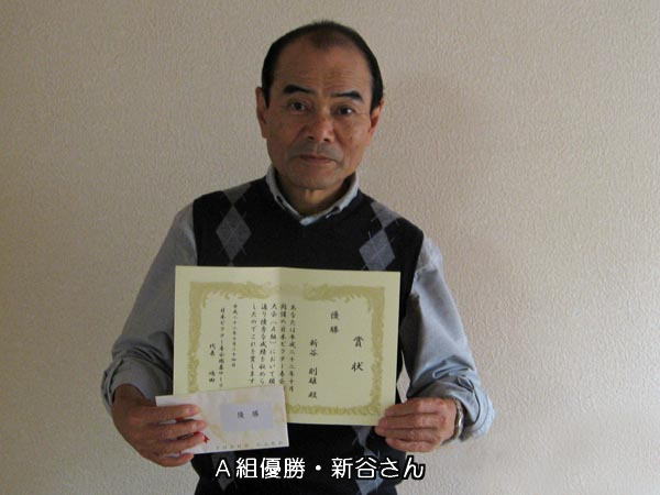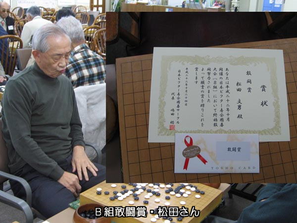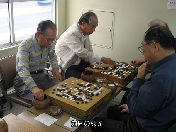 | s 平成22年10月24日(日)横浜囲碁センターにて寿会囲碁愛好者21名が参加して 恒例の秋季囲碁大会が開催されました。 当日は、午前11:00 〜午後5:00まで、棋力別にA,B,Cの三クラスに分け熱戦が展開され、 次の皆様が見事入賞されました。 入賞者の喜びの様子をご覧ください。 以下敬称略 A組・・(優勝)新谷、(準優勝)大角(敢闘賞)定藤 B組・・(優勝)本城、(準優勝)岡部(敢闘賞)松田 C組・・(優勝)春日、(準優勝)山本(敢闘賞)東 |