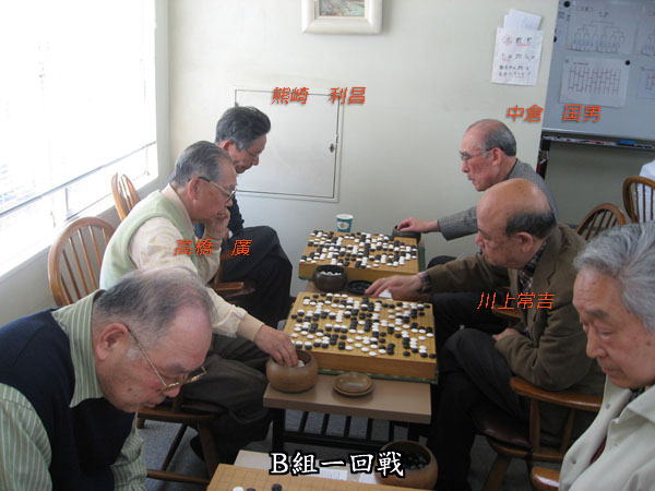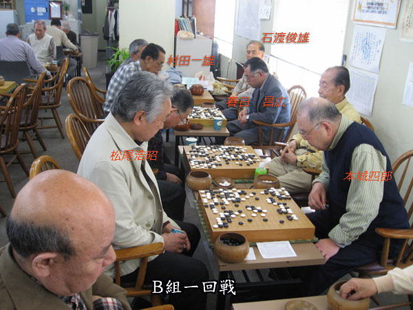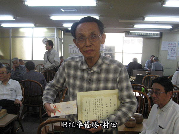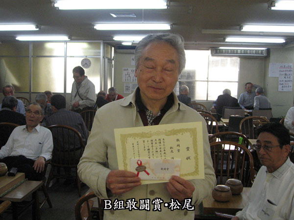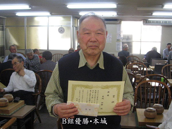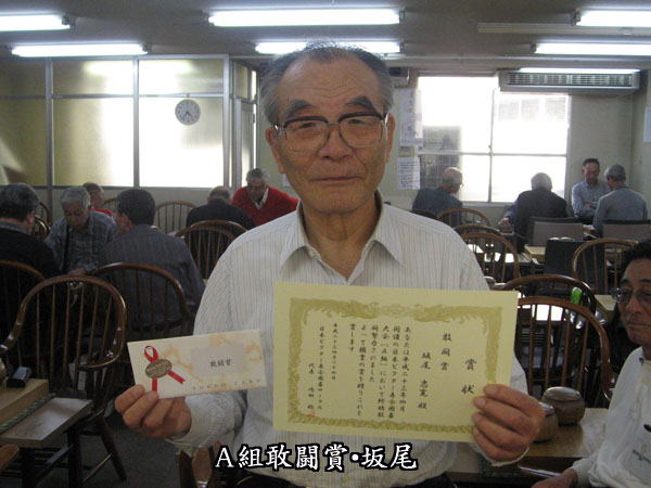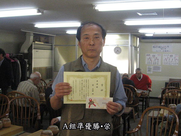 | s 平成23年4月24日(日)横浜囲碁センターにて寿会囲碁愛好者が参加して恒例の春季囲碁大会が開催されました。 棋力別にA,Bの2クラスに分けトーナメント式で、また敗者復活の敢闘賞をめざした熱戦が展開されました。 当日は、公式対局や公式戦終了者同志の自由対局などで、午後5:00まで存分に囲碁三昧の一日を過ごしました。 参加者の皆様の対局の様子及び入賞者の喜びの様子をご覧ください。 以下敬称略 参加者(計20名) A組 榮 史郎・ 坂尾 忠寛・ 池田 裕・ 新谷 則雄・ 嶋田 稔 岡田 暁・ 岡田 幸吉・ 高橋 聡一 B組 大角 基生・ 村田 一雄・ 石渡 俊雄・ 本城 四郎 岡部 幸夫・ 高橋 廣・ 川上常吉・ 山本 三樹夫 松尾 浩昭・ 春日 昌広・ 熊崎 利昌・ 中倉 国男 結果 A組・・(優勝)新谷、(準優勝)榮 (敢闘賞)坂尾 B組・・(優勝)本城、(準優勝)村田(敢闘賞)松尾 |