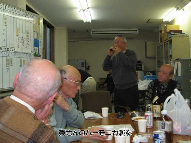 次に、岡田幸吉さんの乾杯の音頭で宴会をスタート、和気あいあいの中で、日頃の手合いの反省や・感想に話がはずむと共に、東信宥さんのハーモニカ伴奏での歌合戦もあり時間の経過とともにおおいに盛り上がる会となりました。