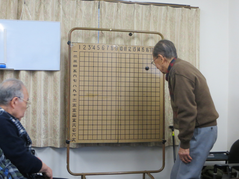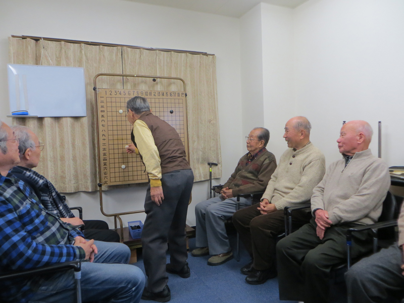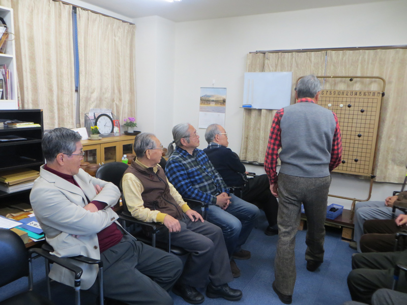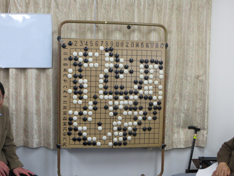 この日の目玉は連碁、AB、二チームに分かれ一人が一手づつ交代で打ちあう試合を最高齢の大角さんの着手で試合スタート、一喜一憂の打ち合いが行われました。