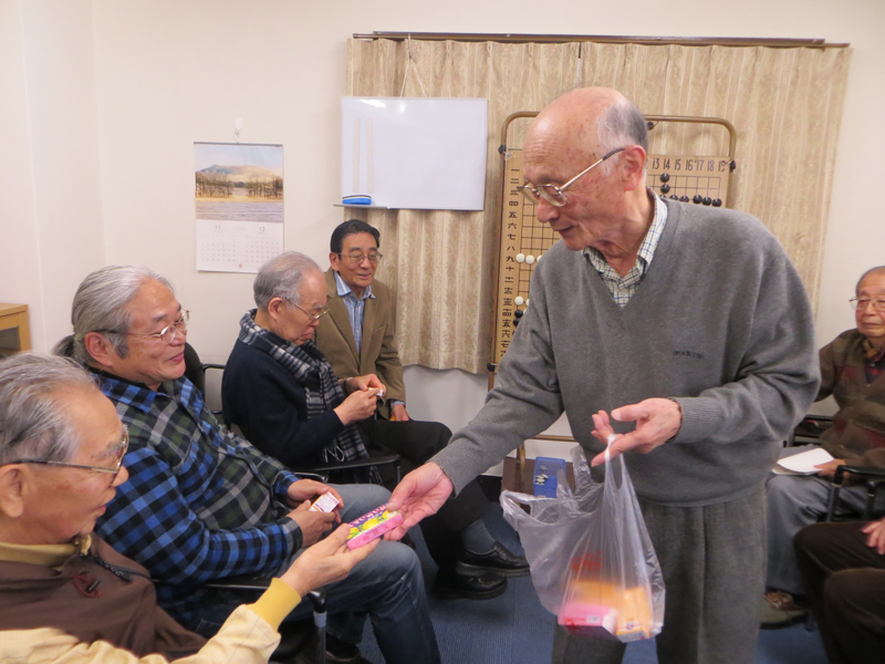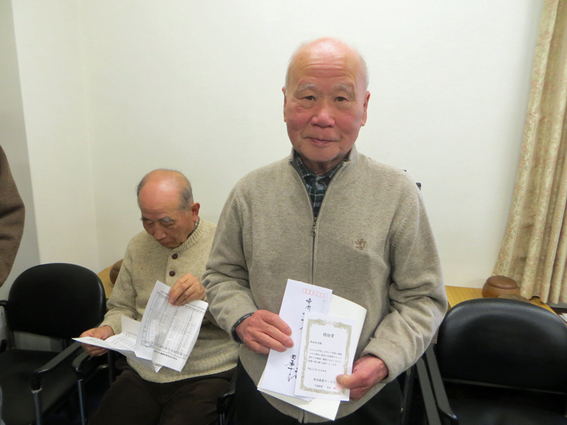 途中、勝敗の決着前に一時対局を中断、寿会囲碁サークル発足30周年を祝し、歴代のサークルリーダーとして、お世話をいただきました、大角さんと岡田幸吉さんに感謝状を贈り、次に今年1年間を振り返り、年間最高成績をおさめられた、大角さんに最優秀賞を、又、一年間の例会に欠かさず参加された岡田さんに皆勤賞が贈呈されました。おふたりは、めでたいダブル受賞となりました。