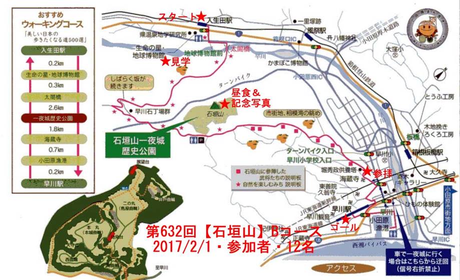 ◇催行日 2017年2月1日(水) 天気 晴れ ◇コース 箱根登山鉄道入生田駅→地球博物館→石垣山一夜城本丸跡→二の丸跡→JR早川駅 |
