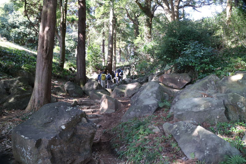 2月1日(水)10時、好天に恵まれ12名が入生田駅に集まりました。先ずは入生田駅からすぐ近くにある特徴的な建物を備えた「生命の星・地球博物館」前庭にて朝礼後、博物館に入館、約30分の自由見学後、博物館から一夜城までは約3、2キロの本格的なハイキングスタート。 石垣山は262mの低山だが、豊臣秀吉と北条氏が合戦を行った際、一夜にして城を築いたという「一夜城」の城跡がある里山、豊臣秀吉が、ここに総石垣の城を築いたことから石垣山と呼ばれるようになったとのことでした。 11時30分に本丸跡に到着、見物台から見える丹沢山系、小田原城、相模湾などの景色を楽しんだ後、 広い芝生の広場がある「二の丸跡、二の丸櫓台跡」へ、ここにはベンチもあり、丁度良い昼食場所でした。 昼食後に全員で集合写真を撮り下山開始、13時10分に小さな駅舎の早川駅に到着、ハイキングは終了・解散致しました。 |