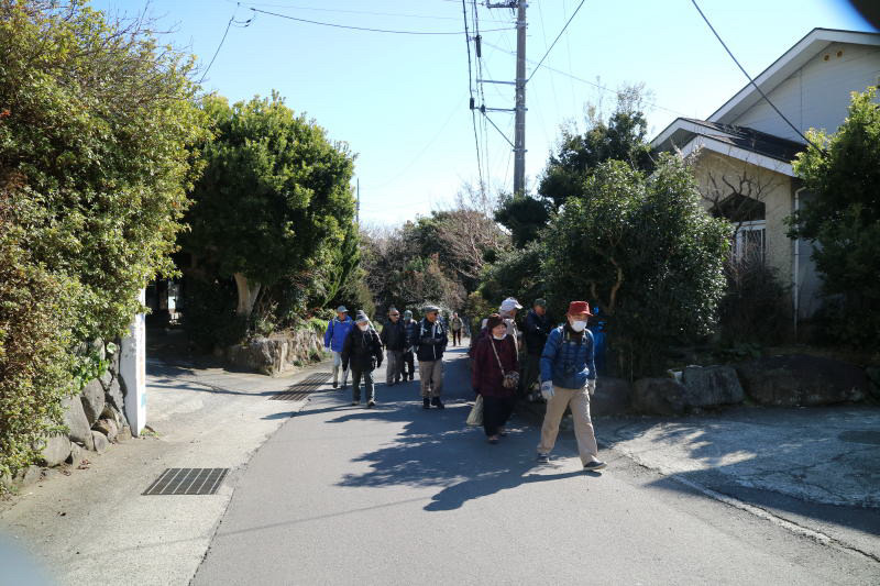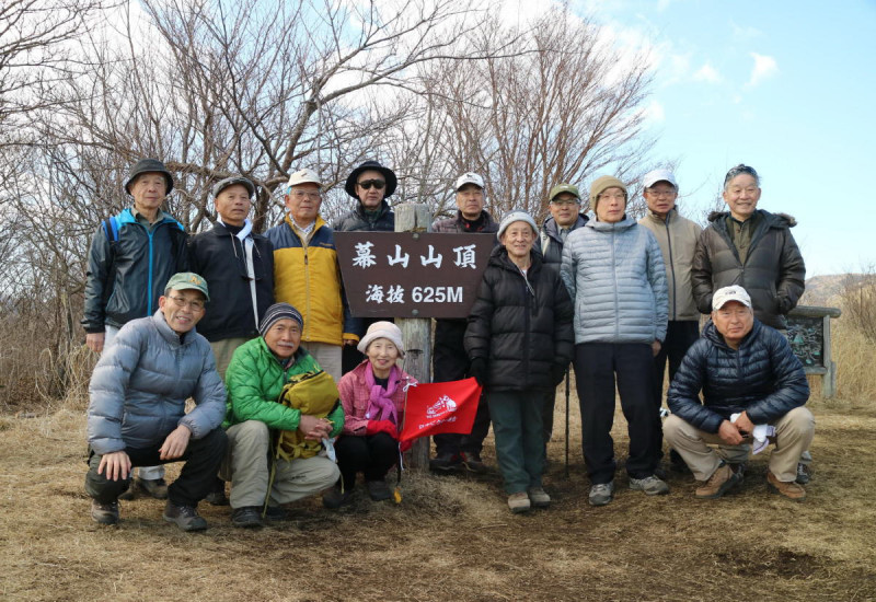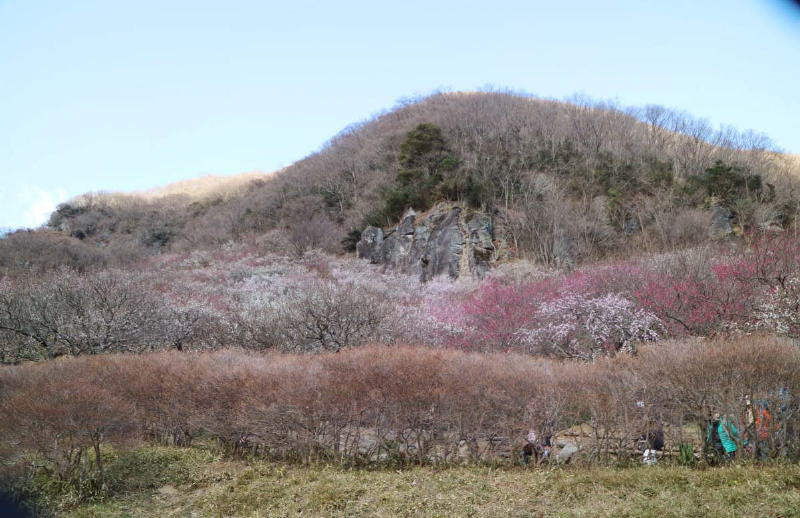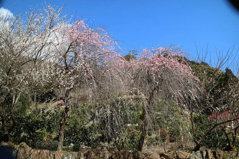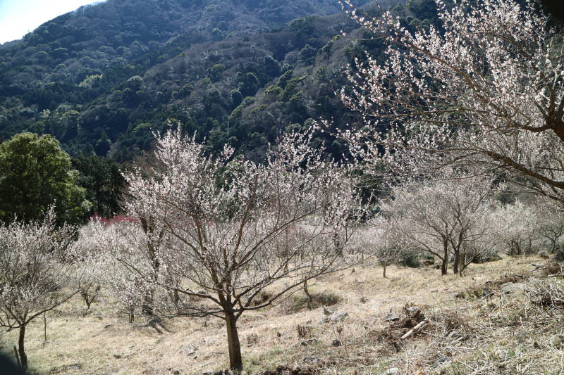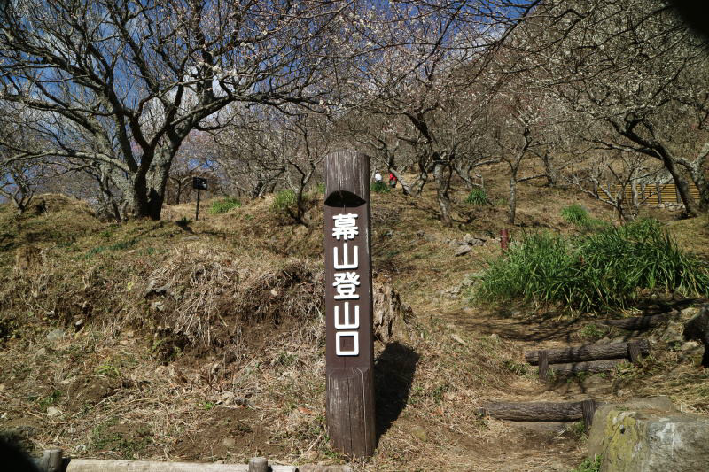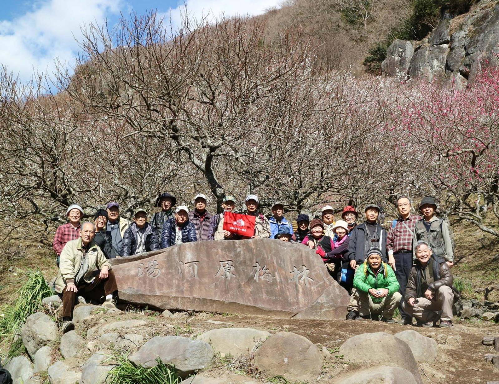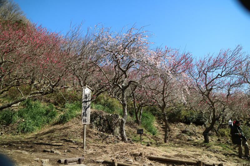 天気は快晴、絶好の観梅日和の中22名が湯河原駅に集合、10:00発のバスにて出発点の鍛冶屋に向かう。神社の境内にて朝礼・準備体操、境内のパワースポット楠の大木に鋭気をもらい出発。 ミカン畑や梅の木が点在する道をすすむが結構な急坂、全員息が弾むが梅の香りにホット一息つきながら幕山公園着。幕山公園は約4000本の紅梅・白梅が山一面に咲き誇る名所でちょうど五分咲きの見ごろ。 しだれ紅梅の木々が咲き誇る中を小散策、梅の花と香りを楽しみながら全員で写真撮影、ここでCコースは公園内散策、Bコースは幕山ハイキングに分かれ再スタート。梅が咲き誇る山道を進むが坂道の連続で息が上がる。途中眼下に見下ろす相模湾・真鶴半島・大島の絶景に助けられ何とか中腹の東屋にたどり着き小休止。 ここで元気回復し再び頂上を目指し13:00幕山頂上(625m)着、ちょっと遅い昼食をとり記念撮影。本来の予定ではここから南郷山経由で鍛冶屋に下りる計画だったが思ったより時間がかかってしまったため、計画を変更し 幕山公園に戻ることとした。 下りは快調で登り90分を60分で無事下山14:30公園着、一服後15:05分のバスで湯河原駅へ向い解散となった。 |