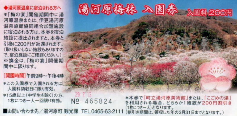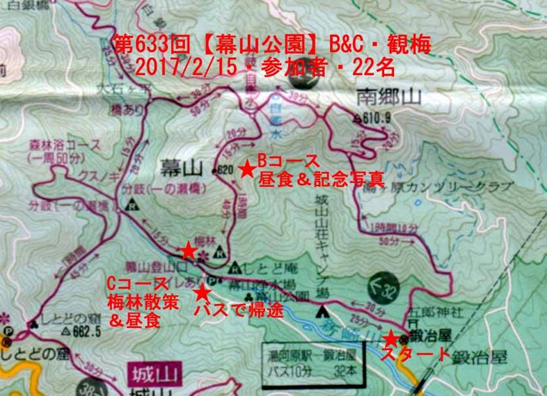 ◇催行日 2017年2月15日(水) 天気 快晴 ◇コース 湯河原駅(バス10:00発)→(バス10分)鍛治屋→(40分)幕山公園 Bコース:幕山公園→(90分)幕山→(60分)幕山公園→(15分)湯河原駅駅 Cコース:公園散策後解散 |