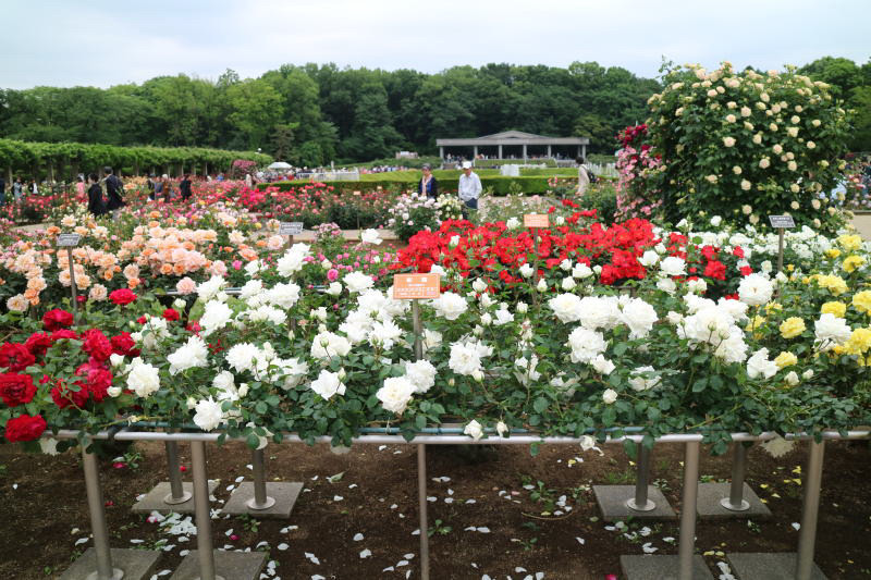 色は白、黄色、赤、深紅、紫など、単色、グラデーションの付いたもの二色混合のもの等々多種多様である。萎れた花は係員が巡回して摘み取っており綺麗に咲いていた。ちなみに公園協会のホームページを見るとバラ園の殺虫等で3千4百万円支出しておりバラは金が掛かると実感した。