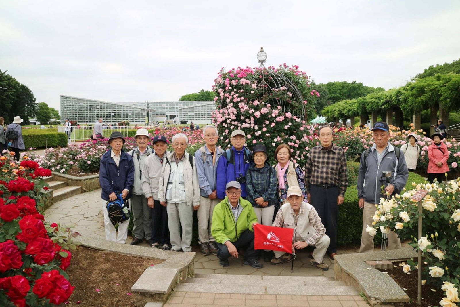 温室の前にはカリオン(複数個の鐘で音階を出す)により毎正時毎に大音響で時を知らせていた。昼近くになったので昼食をとり集合写真をバラ園で撮った。そののち一時間の自由時間をとりバラ園を散策した。「ばら園」は本日の花鑑賞のメインである。
