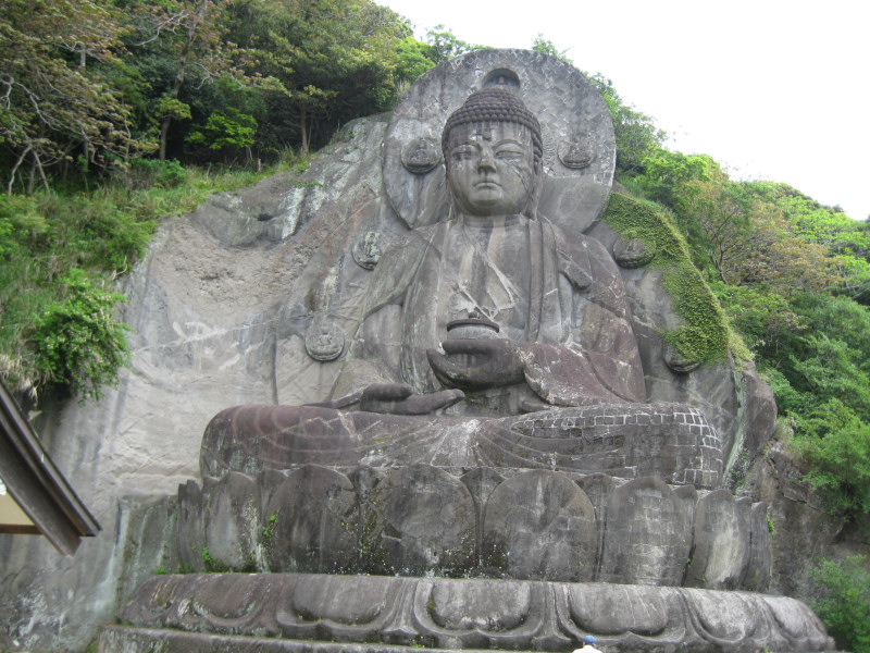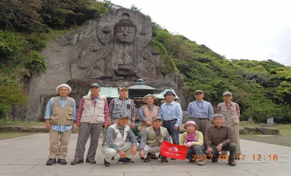 ◇参加者11名(敬称略) 山本三樹夫・川崎勝弘・三木吉弘・渡辺信久・脇坂宜志・土居修治・多田 晋・小池由美子・ 山内浩司・景山康二(幹事)・福山宰治(幹事) ◇メモ 房総半島の南部、千葉県安房郡鋸南町と富津市の境に位置する標高329.4mの山が別名鋸山だ。正式名称は乾坤山(けんこんざん)と言うらしい。山は凝灰岩から成り立っていて古くは房州石と呼ばれ露出した山肌の岩が鋸の歯状に見えることからこの名が付いたとされる。 東京湾を久里浜港から金谷港まで約40分の船旅を堪能しよう。集合場所の久里浜駅には11名が集まり、8時25分にスタート。JVCケンウッドの工場前を通り、20分程で久里浜港のフェリー乗り場に到着。フェリー内は自由散策であり海上は小型漁船から大型貨物船までここ数年は1日当り約400〜700隻が往来する海上交通路である。船旅も終わりになり金谷港着岸後、鋸山ロープウェイ乗り場へと脚を進めた。 ロープウェイから東京湾を望むとさすが海の銀座であり絶景を楽しませてくれた。今回の回遊コースは一番長い90分コースを選択した。早速、一行は最初の場所山頂展望台から百尺観音を訪れた。そこには6年の歳月がかかって出来上がった高さ30mの観音石像が「よく来たな!」と迎えてくれた。 次は「地獄のぞき」に行ってみた。さすが鋸山の名所の場所だ。勇気を振り絞ってカメラマンを除いて全員で地獄を覗いて見たら足元がすくんでしまった人もいた。「カチャ」。 残るコースは「千五百羅漢」と「日本一の石大仏」だ。羅漢は名工、大野甚五郎とその門弟によって刻まれたもので人間の喜怒哀楽が表現されている。最後は日本寺石大仏だ。建立当時の高さは37.7?、その後仏師によって修復されたが像高は31mとなった。ここで記念写真と昼食をとって、午前中の回遊は終了。 ロープウェイ山麓へは30分程度の登り階段だが、さすがA・Bコースを歩いている健脚揃いのため、無事にロープウェイ発着場に到着。ゴンドラに乗って空中散歩を楽しんで鋸山に分かれを告げた。最後は東京湾散歩だ。フェリーの中では仲間と会話が弾み40分の船旅が終了になった。久里浜駅到着後解散となる。 |