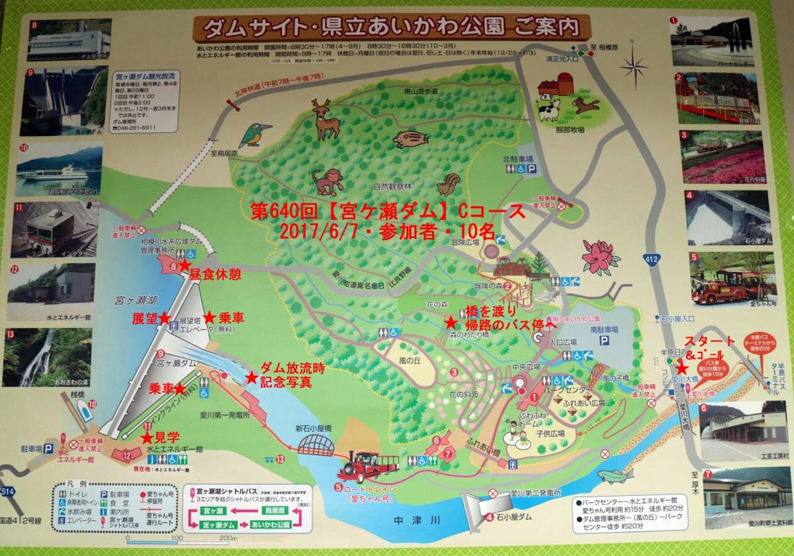 ◇催行日 2017年6月7日 (水) 天気 曇り ◇コース 小田急本厚木駅 9時40分集合 本厚木バスセンター→(バス)愛川大橋→石小屋ダム→宮ヶ瀬ダム下→宮ヶ瀬ダム上→ 県立あいかわ公園→愛川大橋→(バス)本厚木駅 |