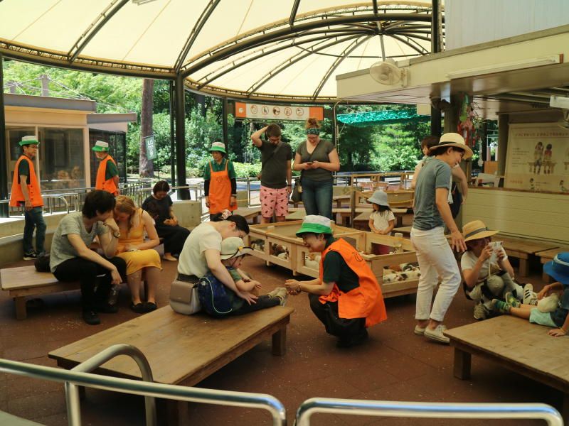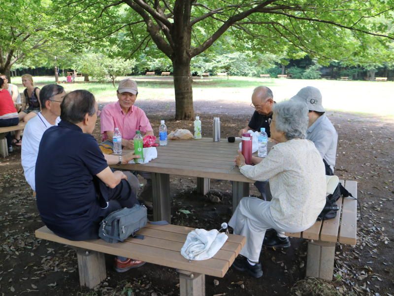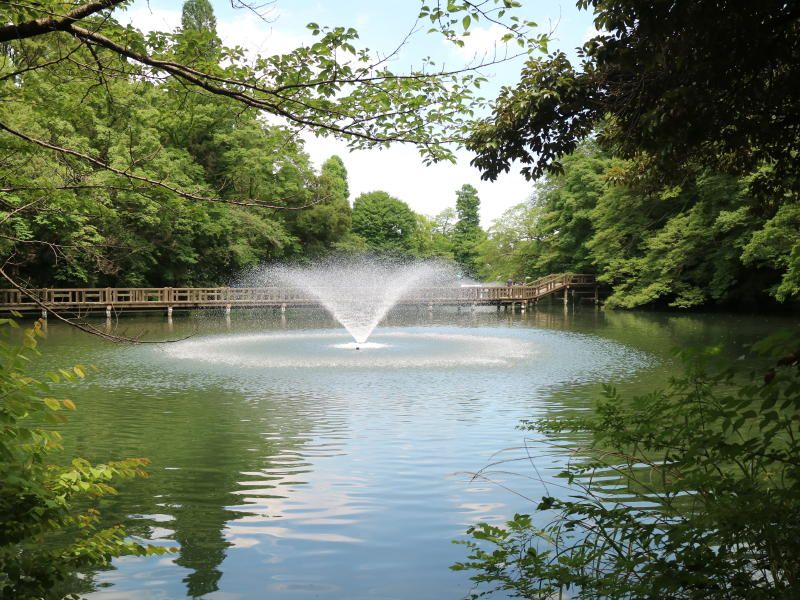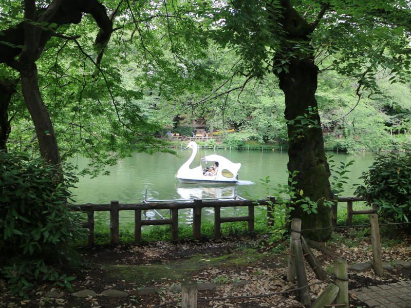 昼過ぎの池にはスワンボートがのどかに浮かんでおり、池の周りは木々の葉の緑に覆われ心が安らぐ。ここで集合写真を撮る。休日にはアクセサリー、似顔絵など露店が20店以上、曲芸、マジック、紙芝居、楽器演奏など大道芸人が10人位でわいわいがやがや賑やかな広場になる。