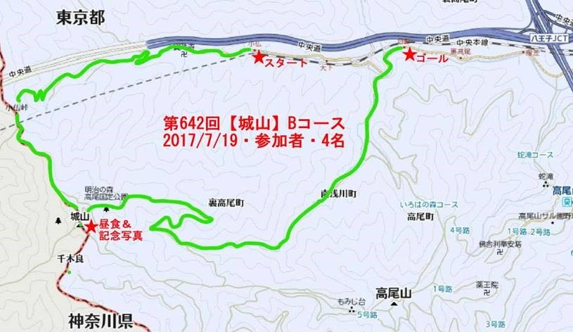 ◇催行日 2017年7月19日(水) 天気 晴れ ◇コース JR高尾駅北口 10時集合 高尾駅→(バス)小仏バス停→小仏峠→城山→日影バス停→(バス)高尾駅 |