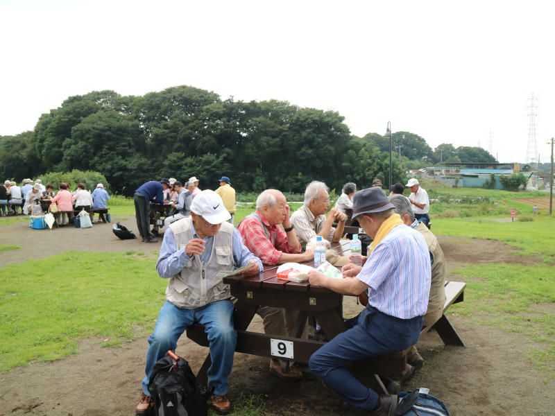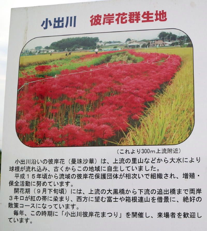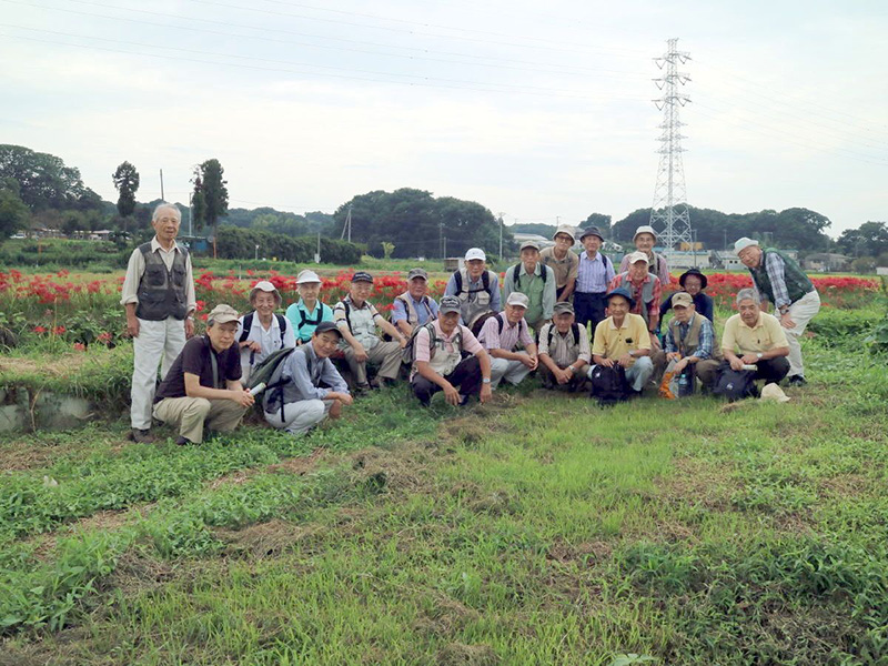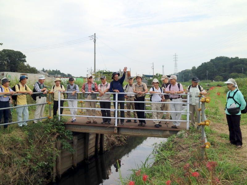 ◇参加者21名(敬称略) 後藤 孝、小倉 通男、山本 三樹夫、城市 靖三、舩坂 栄一、中平 勇、大曽根 収、 太田 一穂、菊池 譲三、三木 吉弘、渡辺 信久、弘海 昭雄、土居 修治、生江 勲、菅野 敏、 加部 祥司、新谷 則雄、古林 茂、弘海 愛子、保田 憲一、根井 淳(記) ◇メモ 定刻9時50分、湘南台駅西口バスターミナルに21名と大勢の参加者が集う。参加者の意欲が高く、予定より10分早い9時57分発文教大学行きのバスに乗り込む。20分ほどで「芹沢入口」に着き、下車する。信号を渡り緩やかな坂を5分ほど登ると、「県立茅ヶ崎里山公園」の入口である。 パークセンター前で朝礼を行い、本日のコース紹介を行う。今日はお彼岸の入りで、小出川の彼岸花(曼珠沙華とも言うらしい)観賞が、メインの狙いであるが、如何かな?10時35分ハイキングスタートする。広場の前の大滑り台の周りは、可愛らしい保育園児が大勢取り囲んでいる。その脇を下りて小川沿いに歩を進め、池まで降りる。 ここから栗林脇を登り返し、峠に出て右折し緩やかな道を下って行くと、腰掛神社にでる。この神社はその昔、日本武尊が東征の時休憩を取った岩が祀られている由緒正しき、お社とのことである。神社前の展望所で、丹沢・大山を望みながら休憩を取る。辛うじて曇り空にも拘らず、富士山がうっすらと眺めることが出来た。 富士山眺望神奈川100選の一つとのことであるが、本当にかすかにしか見えなかった。15分ほど道を下ると小出川に出る。今年の彼岸花は、早咲きの様で満開のピークを過ぎたばかりで、ちょっと残念ではあったが処によっては、まだまだ見栄えがした。小出川沿いに40分ほど彼岸花観賞の散策をし、里の家バーベキュー場へ11時50分に到着、昼食を摂る。 12時35分スタートし、帰路につく。帰路は往路の反対側の散歩道を歩み里山公園の外周を一周するコースを取る。桜の小径・芹沢の池を経由して平成の森を登ると、少し汗ばんでくる。登り切ってスタート地点のパークセンター戻る。 その後バス停「芹沢入口」に向かう。13時50分湘南台駅西口に到着し無事解散となった。彼岸花のころは、例年暑さにこたえるが、今年は汗ばむ程度の快適なハイキングとなった。暑さ寒さも彼岸までかな。! |