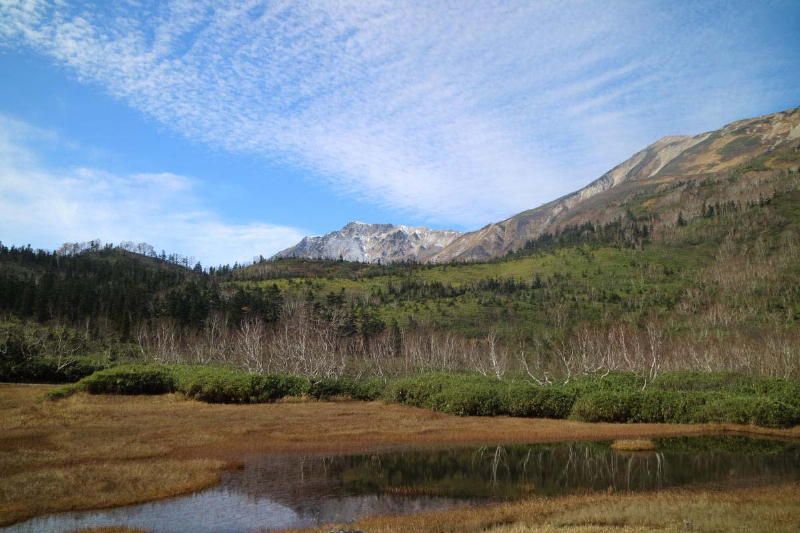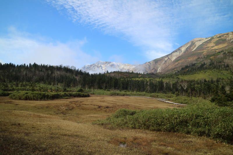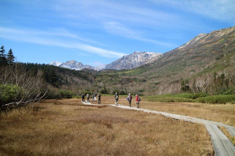 10月18日(水) 朝風呂、朝食をとり8時30分栂池高原駅(823m)からリフトに乗り途中栂の森駅(1571m)で乗り換え自然園駅(1882m)に着く、昨日と同じように1000mを超える標高差である。今日は霧も晴れて雄大な白馬三山、白馬岳(2932m)、杓子岳(2812m)、白馬鑓ヶ岳(2903m)が抜けるような青空に輝いて聳えている。神々しい。 霧が晴れている間は日の光で温かい。ここでBコース、Cコースに分かれ栂池自然園を散策する。Bコースはわたすげ湿原を通り浮島湿原まで散策し、Cコースはわたすげ湿原を散策した。湿原のコースは殆どが木道でできており、湿原には水芭蕉の名残があり春の景色が浮かんでくる。昼食後霧が発生し体感温度が急激に下がる。 来た道を戻りリフトで栂池高原駅に戻り。バスで来た道を辿り午後6時45分横浜駅に全員元気で到着。リフトから眺める素晴らしい景色、神々しい白馬三山、憧れの白馬を散策でき満足であった。本日の歩数5,500歩