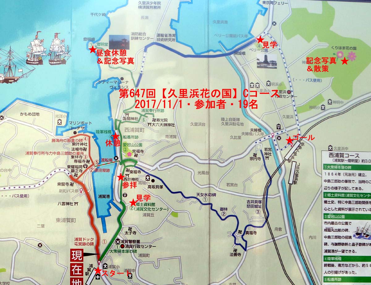 ◇催行日 2017年11月01日(水) 天気 晴れ ◇コース 京急浦賀駅10時集合 浦賀駅→浦賀コミュニティーセンター(分館)→西叶神社→燈明堂→消防総合訓練センター →ペリー上陸記念碑→久里浜花の国→京急久里浜駅 |