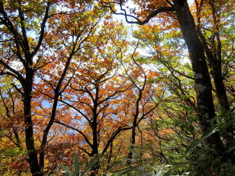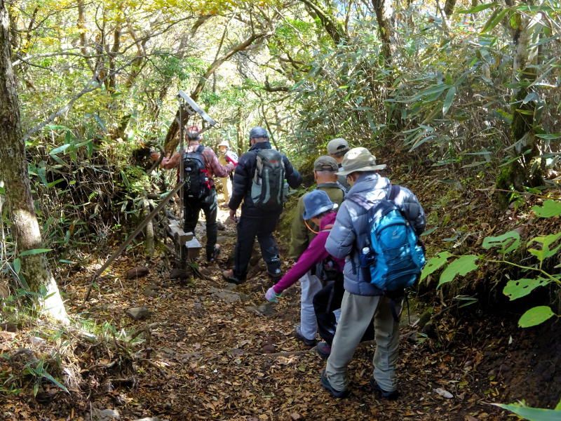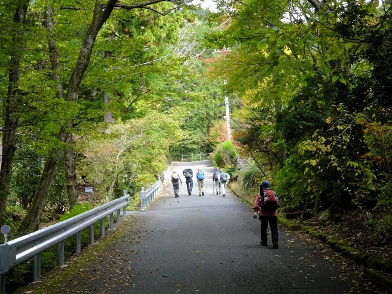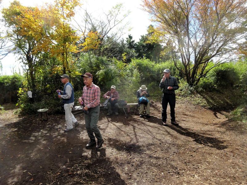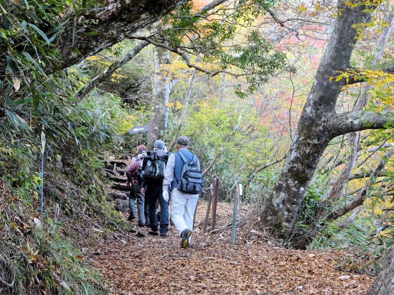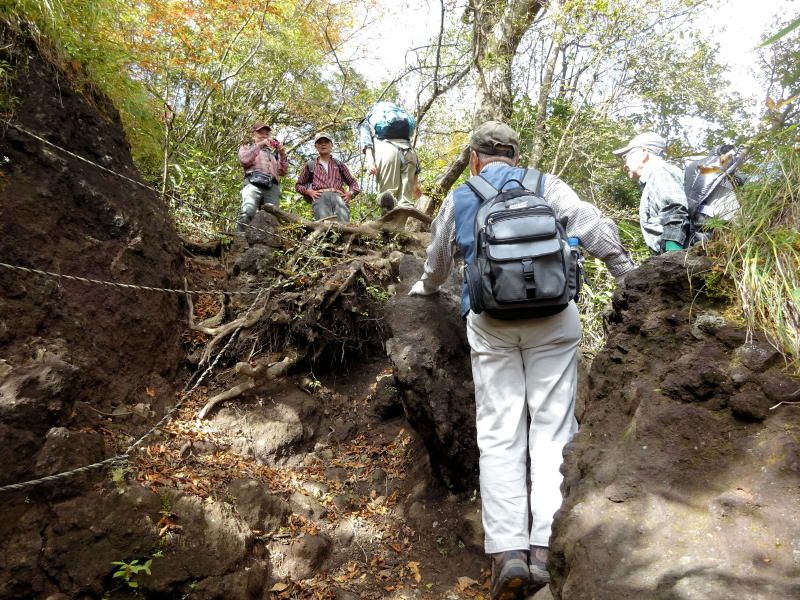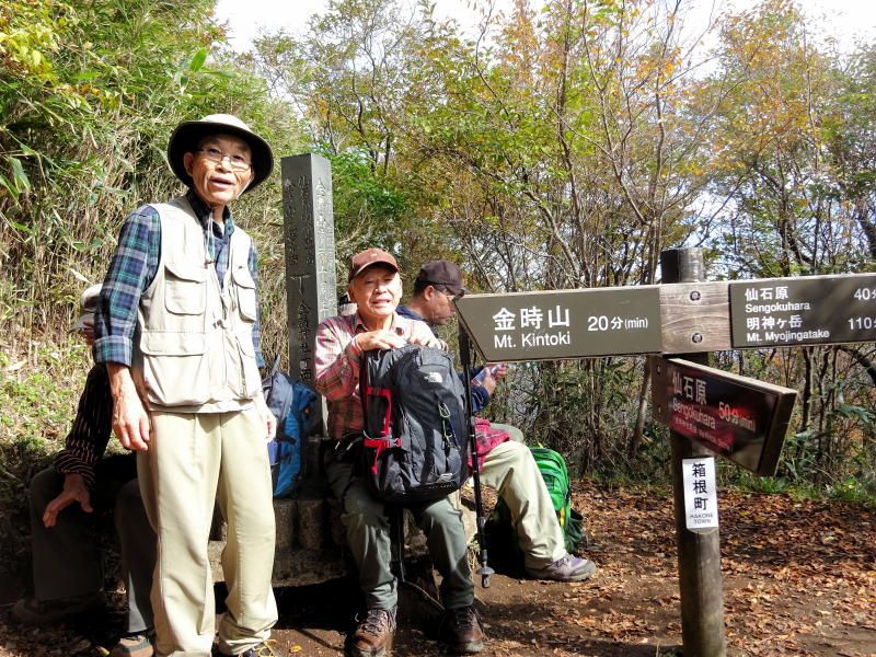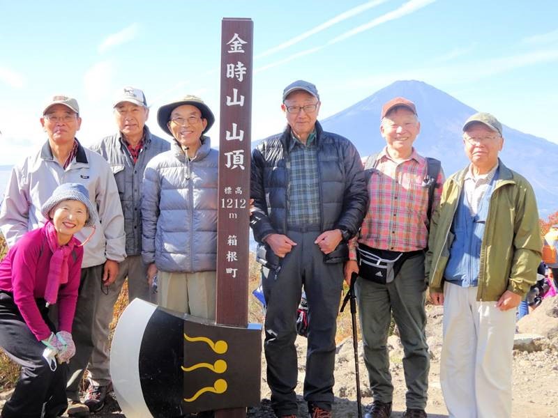◇参加者7名(敬称略) 藤森 文夫、川崎 勝弘、脇坂 宣志、山内 浩司、小池 由美子、根井 淳、景山 康二(記) ◇メモ 天気は晴れ、箱根の紅葉と絶景を求めて金時山を目指す。Aコースで出席率が心配されたが朝8:30小田原駅に精鋭7名が集合、8:45発のバスで麓の仙石へ向かう。このコースはバス代が高いのが気になるが頂上からの絶景には代えられない。9:40仙石着、これから登る金時山を仰ぎ見ながら朝礼及び準備体操後9:50出発。 10分程歩いたところが矢倉沢峠経由のハイキングコース入口、ここで衣服を整え登山道に入る。よく整備された登山道で歩きやすいが体が慣れるまではかなりきつく途端に汗が噴き出るが、幸い心地よい風が汗をぬぐってくれる。途中水分補給しながら10:30 予定通り30分で矢倉沢峠着、小休止で息を整えここから頂上まで1Hの長丁場に備える。 登りもだんだんきつくなるが周辺の山々の紅葉を眺めながら疲れを癒す。振り返ると大涌谷や仙石原がくっきりと眺められ着実に登ってきた感がある。金時神社への分岐点で一休み、いよいよ最後の登りに入る。ロープを使った急斜面を乗り切り11:40金時山頂上(1212m)着。標準時間より10分遅れたが平均年齢75歳を考えると立派なものである。 頂上は相変わらず混んでいるが快晴、真ん中に富士山を望むと左に神山〜大涌谷〜芦ノ湖〜仙石原、右に甲斐駒〜八ヶ岳までくっきりと見え270°パノラマの絶景だ。一気に疲れも取れ12:30までゆっくりと昼食をとることとした。 記念写真撮影後金時神社に向け出発、今度は逆に急坂くだりなのでゆっくり注意深く進む。神社への下りは細かい岩がゴロゴロした道が続き歩きにくく、下りとは言えかなり足にこたえる。何度か小休止し60分かけ金時宿り岩着。14:00最終目的地の金時神社で今日の無事登山のお礼をし、仙石バス停より小田原駅に向かい15:30駅着解散となった。 |