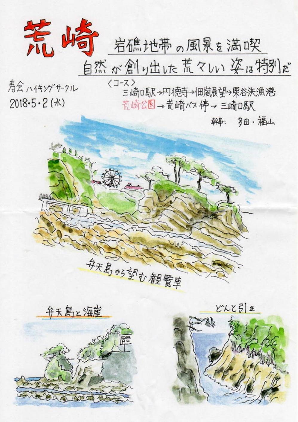 ◇催行日 2018年5月2日 晴れ ◇コース 京急三崎口駅・9時50分集合 三崎口駅→(35分)円徳寺→(30分)佃嵐展望→(10分)栗谷浜漁港→(35分)荒崎公園→ (10分)荒崎バス停→(バス25分)三崎口駅 |