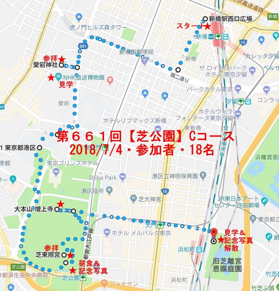 ◇参加者 18名(敬称略) 山本三樹夫、城市靖三、舩坂栄一、中平勇、大曽根収、山田勢津子、川崎勝弘、三木吉弘、 高橋武久、土井繁紀、土居修治、多田晋、平野猛、山本治、加藤博紀、新谷則雄、福山宰治、 生江勳 ◇メモ 朝10時、新橋駅西口SL広場に暑い中、久し振りに18名集合。気温は29℃湿度も高いが薄曇りで台風の影響か風がありハイキング日和である。朝礼後出発、駅近くの飲食店街を通り抜け高層ビルの立ち並ぶオフィス街を最初の目的地愛宕神社を目指して歩を進める。 途中虎ノ門ヒルズ森タワー(247m)を見上げ曲垣平九郎で有名な愛宕神社の出世の階段に到着する。男坂(出世の階段)女坂に分かれ愛宕神社に上り参拝する。海抜26mで江戸・明治時代は見晴らしの良い場所であったが今は高層ビルに囲まれ鬱陶しい。 次に隣のNHK放送博物館を訪ね参観する。高柳先生の発明されたテレビ方式とイの字が展示されておりJVCの初期のVHS VTRも展示されていた。懐かしい。博物館を後にして山を下り東京タワーの近くをとおり、芝公園に向かい公園のベンチで昼食をとる。 公園の中の丘は都心とは思えない程木々や薮があり、また前方後円墳もあり道に迷うほどである。食後、芝東照宮を訪ね広場で芝公園と東京タワーをバックに集合写真を撮る。 次に増上寺を訪ね広い境内をとおり参拝する。更に山手線の外側の海岸に接続している旧芝離宮恩賜庭園を訪ねる。江戸初期の庭園でゆったりとした大きな庭園である。ここでも集合写真を撮りその後解散した。歩数は13,000歩。 ◇ハイキング催行記録 |