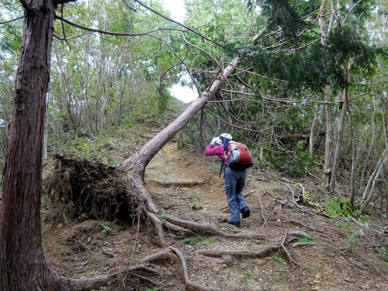 ◇参加者2名(敬称略) 小池 由美子、山内 浩司 ◇メモ 相模湖駅に集まったのは2名。 駅前からバスに乗り、石老山入口で下車。準備体操をして顕鏡寺に向け出発。境内にはギンナンがたくさん落ちていた。融合平見晴台に11時20分に到着。眼下に見える相模湖の水は薄茶色。倒れた木々を迂回しながら歩き、12時10分石老山山頂に着く。 ここで昼食、記念写真を撮り下山する。台風23号、24号の強風で多くの木々が折れたり、倒れたりしていて如何に凄まじい台風だったか想像がつく。大明神展望台に着き一休み。登山道は荒れ放題の為、気を引き締めて下り何とかプレジャーフォレストバス停に到着。台風の後の、とても荒れた登山道だったけれど、注意深く歩き怪我もせずに駅に着けたのは良かったです。 ◇ハイキング催行記録 |
