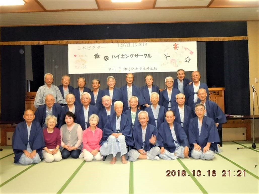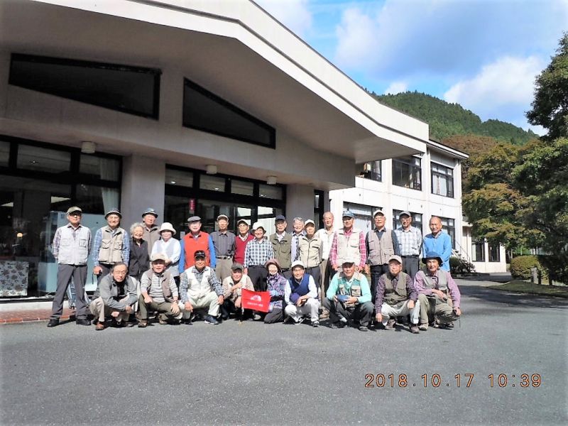 ◇参加者 Bコース 17名 山本 三樹夫、藤森 文夫、成澤 通子、高橋 武久、渡辺 信久、脇坂 宜志、生江 勲、 南 健輔、菅野 敏、多田 晋、橋本 勝、小池 由美子、松山 暁紘、山内 浩司、 新谷 則雄、古林 茂、根井 淳(記) Cコース 9名 稲葉 全彦、後藤 孝、城市 靖三、戸川 照子、土井 繁紀、平野 猛、加藤 博紀、 景山 康二、福山 宰治 ◇メモ 10月16日(火) JR御殿場線 山北駅11時に17名が集合し跨線橋を渡り、蒸気機関車D52前で朝礼を行う。高橋リーダーより今日のコース説明が丁寧にされ、そのあと南さんご指導のもと入念なる準備体操を行い、今日のコースに備える。 11時20分 河村城址に向かって出発する。およそ10分坂を登ると、廣澤山盛翁寺に着き、今日、明日の宿泊ハイクの安全祈願をする。歩を進めるとさらに急坂と階段を、息を切らしながら登ると、河村城址に到着する。額と背中に汗が流れる。城跡を散策すると初冠雪の富士を眺めることが出来た。 南東方向に歩を進め、小田原一帯相模湾を見下ろせる眺望の良いベンチに腰を下ろしゆっくりと昼食を摂る。12時30分 河村城址公園に別れを告げ、洒水の滝に向かって坂を降りて行く。山道を降りた辺りで、農家の庭先で栗、銀杏、柿など秋の味覚を販売しており、それぞれお土産にお買い上げされていた。13時33分 本日の目的地「洒水の滝」に到着する。滝壷直下までは行けないが、瀟洒な滝を眺めながら休憩する。後は国道沿いに山北駅へひたすら歩く。14時20分 山北駅へ予定より早めに到着する。 足に少々の疲れを感じる快適なハイキングとなった。15時10分 Cコースの9名と合流し、総員26名でホテルの送迎バスで中川温泉「時の栖」に向かう。早めの到着で、夕食までゆっくり各自部屋でくつろぎ、「美人の湯」にも浸かる。18時00分高橋代表幹事のご挨拶を聴き、乾杯の後、大宴会がはじまる。山海の珍味に舌鼓を打ち歓談、そして本日のメインイベント懐かしの歌、思い出の歌、新曲等々の熱演カラオケタイムと楽しい時を過ごす。 10月17日(水) 夜半の雨もあがり、予想外の好天となり本日も快適な時を過ごせそうな予感がする。朝食のあと、チェックアウトし、ホテル玄関前で集合写真を撮る。昼食のBBQまでの間、中川の河原に降りたり、周辺を散策したり思い思いに時を過ごす。紅葉にはまだ早いが、すっきりとした爽やかな秋の陽を浴びる。10時50分 BBQコンロに火が入る。カルビ・タン・海老・烏賊・野菜・焼きそば等々山もりの食材がドンドン焼かれていく。食べ物たっぷり飲み物もたっぷり、会話もたっぷり楽しさたっぷりの時間となった。 13時00分 ホテル送迎バスに乗る。ホテルのご厚意により、途中「山北・道の駅」に寄り、各自おみやげを買うことが出来た。13時50分 新松田駅に到着し、無事に解散となった。今回の宿泊ハイキングは、近場の開催、BBQの実施など新しい試みに恐る恐るチャレンジして見ました。天候に恵まれたこともありますが、時間にゆとりある行程で、ゆっくり歓談の時間もたっぷり取れ、また皆さんのご協力のもと、本当に楽しい時を過ごせたと思っております。 |