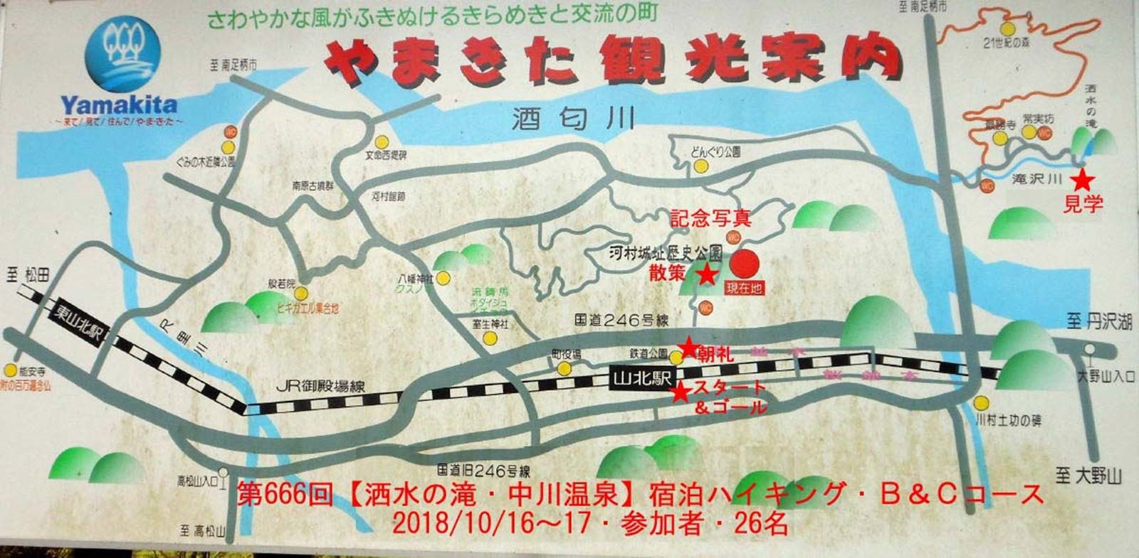 ◇催行日 2018年10月16日(火)薄曇り 10月17日(水)晴れ ◇コース 山北駅 Bコース 11時集合 山北駅→河村城址→洒水の滝→山北駅→中川温泉 山北駅 Cコース 15時集合 山北駅→中川温泉 |
