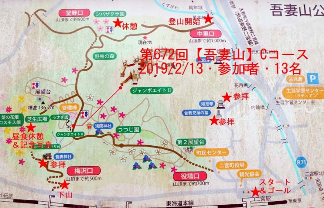 ◇催行日 2019年2月13日(水) 曇り ◇コース JR二宮駅 10時集合 二宮駅→知足寺→中里口→シバザクラ園→展望台→吾妻神社→梅沢口→二宮駅 歩程・90分 担当・新谷/平野 写真・景山