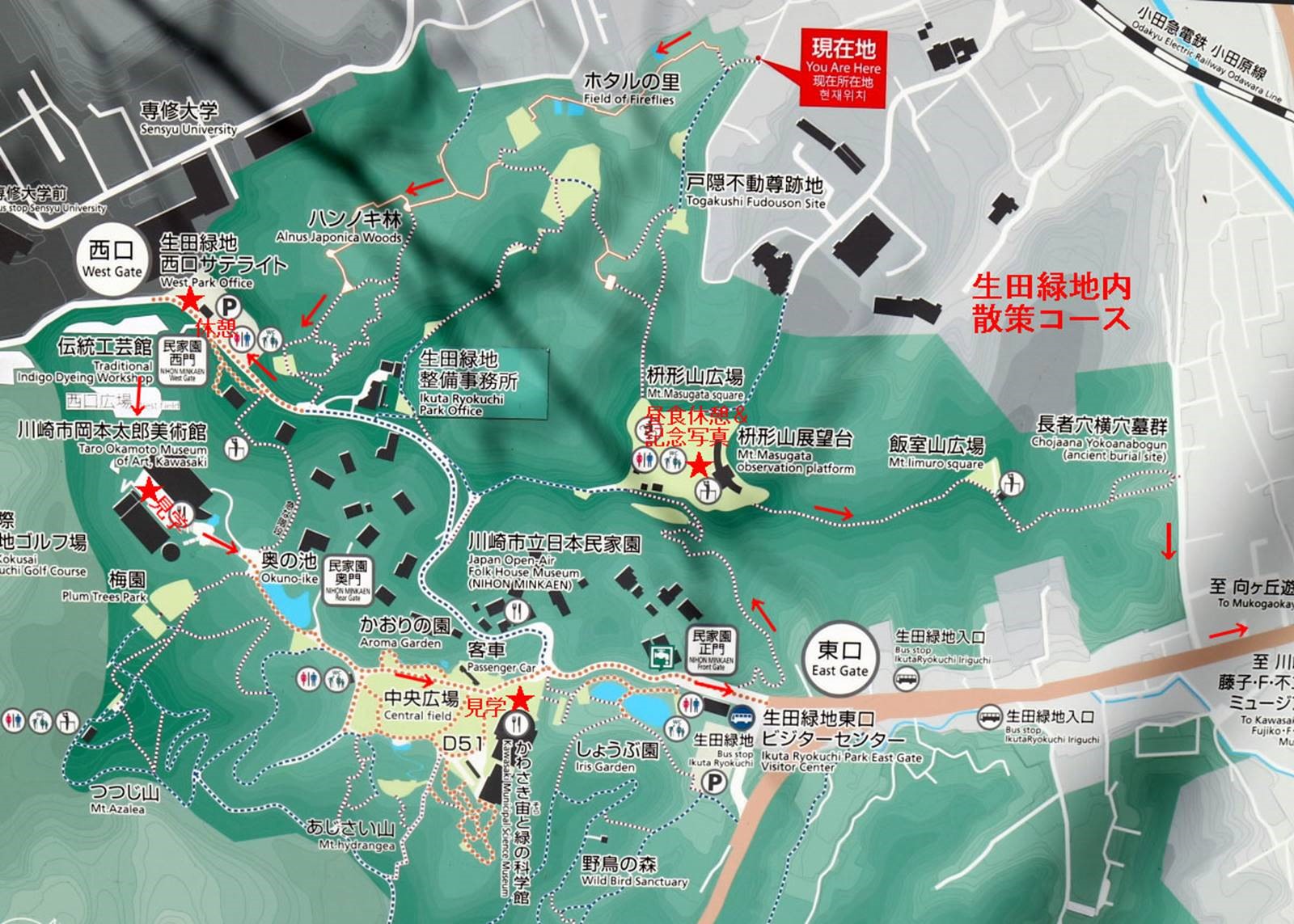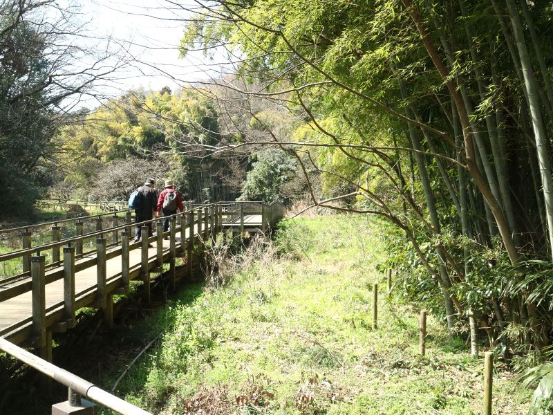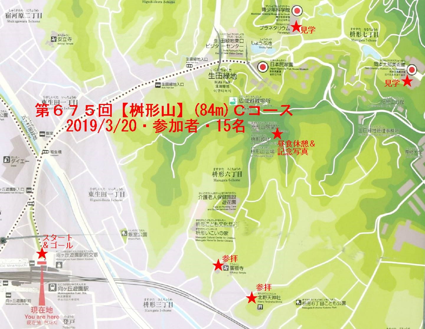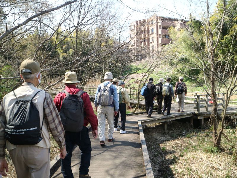 ◇ハイキング催行記録 ◇参加者15名(敬称略) 稲葉全彦、後藤 孝、井澤 章、舩坂栄一、中平 勇、大曽根 収、山田勢津子、太田一穂、 渡辺信久、弘海昭雄、土井繁紀、松山暁紘、新谷則雄、保田憲一、生江 勳(記) ◇メモ 朝 10 時、小田急向ヶ丘遊園駅に 15 名集合。空は晴れ温かいハイキング日和である。朝礼後出発、駅近くの商店街を通り抜け崖下を小田急線に沿って進み、宅地開発前は大木に覆われていた暗闇坂を登り広福寺に着く。平安時代初期に創建された古寺である。広福寺を下山し生田緑地に歩を進める。谷戸に入りホタル池、体験型水田等に沿った木道を歩いた後、尾根に登る。 緑地展示所を参観し一休みの後、尾根を下り岡本太郎美術館に立ち寄る。巨大な「母の塔」に感心し「芸術は爆発だ」が思い出される。メタセコイア並木を抜け「かわさき 宙(そら)と緑の科学館」を参観し、大きな合掌造りのある日本民家園の前を通り過ぎ標高 84m の枡形山に登る。そこでは幼稚園児が保母さんや母親と輪を作り賑やかな声が聞こえてくる平和な場所であったが、戦国時代には城が作られ攻防が繰り返えされ幾多の悲劇があったところで感慨深い。 頂上で昼食をとりエレベーターで展望台に登る。360 度見渡せ、定番のスカイツリーや東京タワー、新宿、武蔵小杉、横浜の高層ビル群が見えた。富士山は心眼でおぼろげに見えるような気がした。集合写真撮影後下山、高度差 60m の木製階段を下り向ヶ丘遊園駅に到着し解散した。 歩数は 13,000 歩。 |