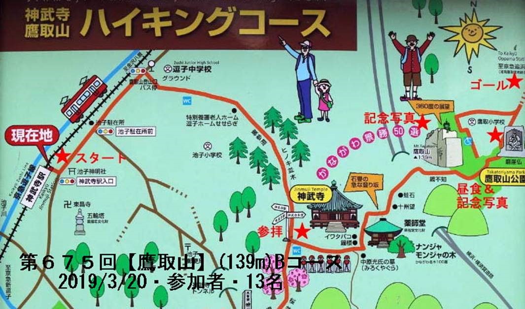 ◇催行日 2019年03月20日(水)晴れ ◇コース 京急神武寺駅 10時集合 神武寺駅→(40分)神武寺→(10分)奥の院→(15分)十州望→(10分)鷹取山→ (5分)摩崖仏→(5分)鷹取山→(40分)京急・田浦駅 歩程・125分 |