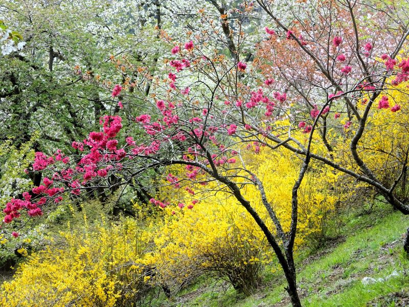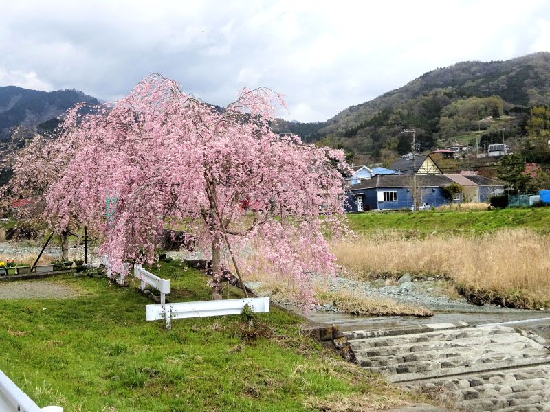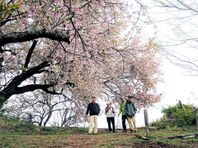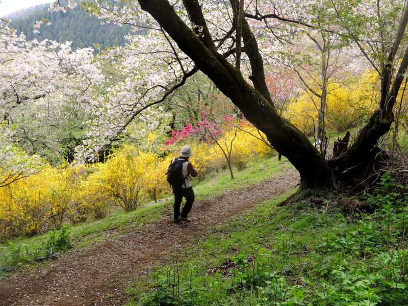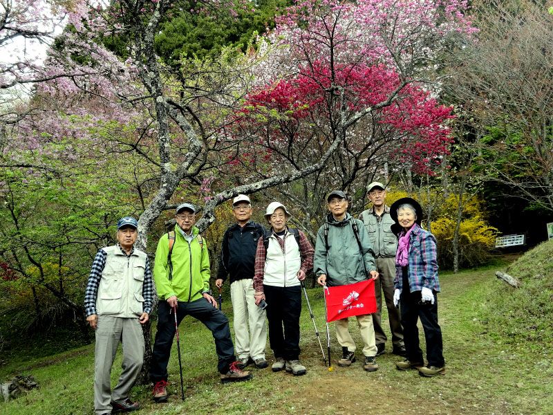 ◇ハイキング催行記録 ◇参加者7名(敬称略) 山本 三樹夫、藤森 文夫、高橋 武久、南 健輔、山内 浩司、根井 淳、小池 由美子(記) ◇メモ 曇り空の中、新松田駅に7名が集まる。 9時40分発のバスに乗り、田代向で下車、橋を渡りここで朝礼。準備体操をしてスタートする。 土手沿いの枝垂れ桜が、見頃でとても綺麗。歩き始めて40分、鉄塔の下で、わらび取りに熱中。 ここから急な下りとなり、小さな川を渡ったら今度は大変な登り。東屋に着いたのが12時過ぎ、 更に歩を進めて桜の花や、レンギョウの花の傍で昼食。記念写真を撮り下山する。赤やピンクの桃の花、 薄いピンクの桜の花、黄色のレンギョウに囲まれた山道を歩き、最明寺史跡公園に着く。 池の周りの枝垂れ桜がとても綺麗。素晴らしい花景色を後にして、西平畑公園を経由して新松田駅に 15時10分に無事到着。青空だったら、もっと素敵な花の色だった事でしょう。 |