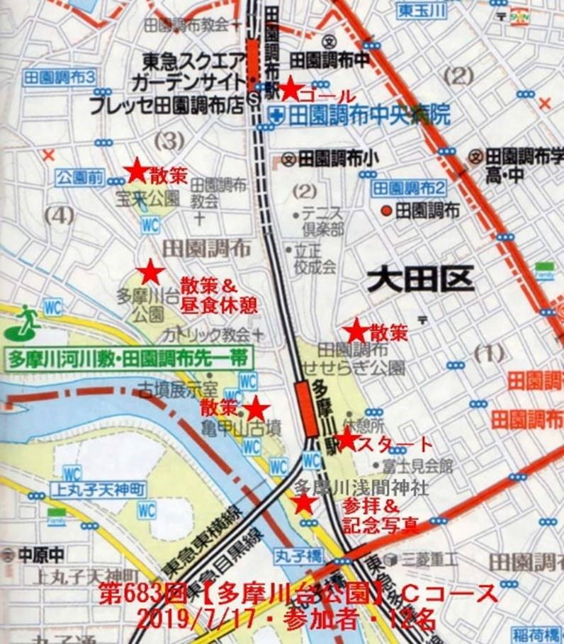 ◇催行日 2019年7月17日(水) 天気 曇り ◇コース 東急東横線 多摩川駅南口 10時集合 多摩川駅→せせらぎ公園→浅間神社→亀甲山古墳→多摩川台公園→宝来公園 →田園調布駅 |