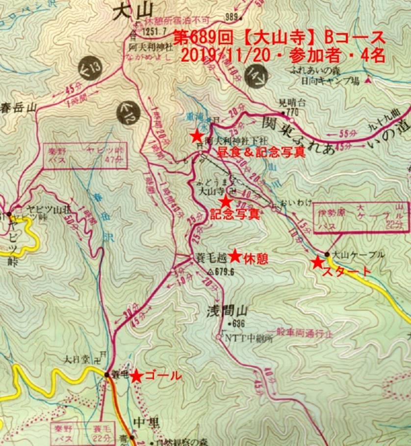 ◇催行日 2019年11月20日(水)晴れ ◇コース 小田急伊勢原駅 9:30集合 伊勢原駅(9:40発)→(バス30分)大山ケーブル駅→(40分)大山寺→(30分)大山下社(昼食) →(30分)蓑毛越え→(40分)蓑毛→(バス)秦野駅 |