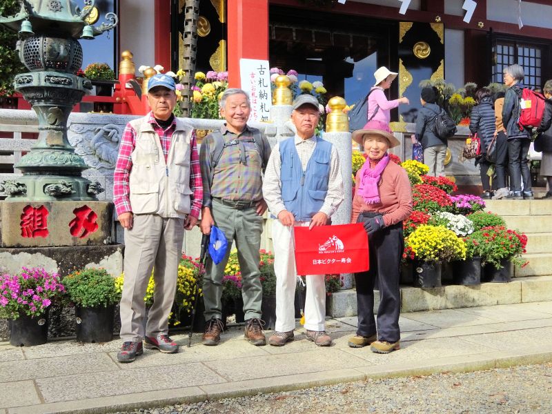 ◇メモ 伊勢原駅に4名が集まる。 9時40分発のバスに乗り、大山ケーブル駅で下車。今日は大山寺、大山下社、蓑毛越えなので、のんびりと歩く。大山寺の赤いモミジは少し早く、下社のモミジの紅葉は最盛期で綺麗だった。下社の境内では菊花展をやっていて、みごとな菊の鉢物を見る。紅葉の下で昼食を摂る。12時30分下山開始。蓑毛越えの登山道は先日の台風19号で倒木があったり、崩れていたりして荒れており慎重に歩き、無事に蓑毛バス停に着く。14時5分発のバスに乗り秦野駅に 到着。解散となった。 ◇ハイキング催行記録 ◇参加者 4名(敬称略) 山内浩司、脇坂宜志、景山康二、小池由美子 |