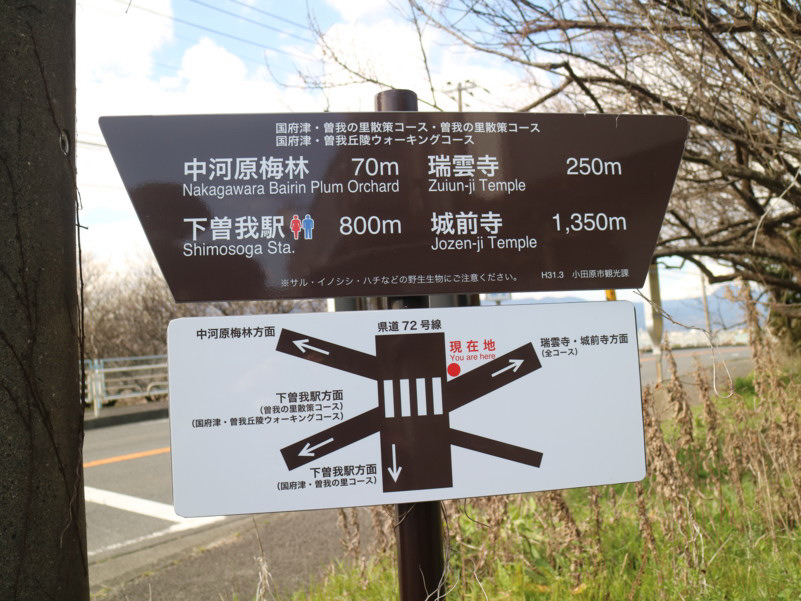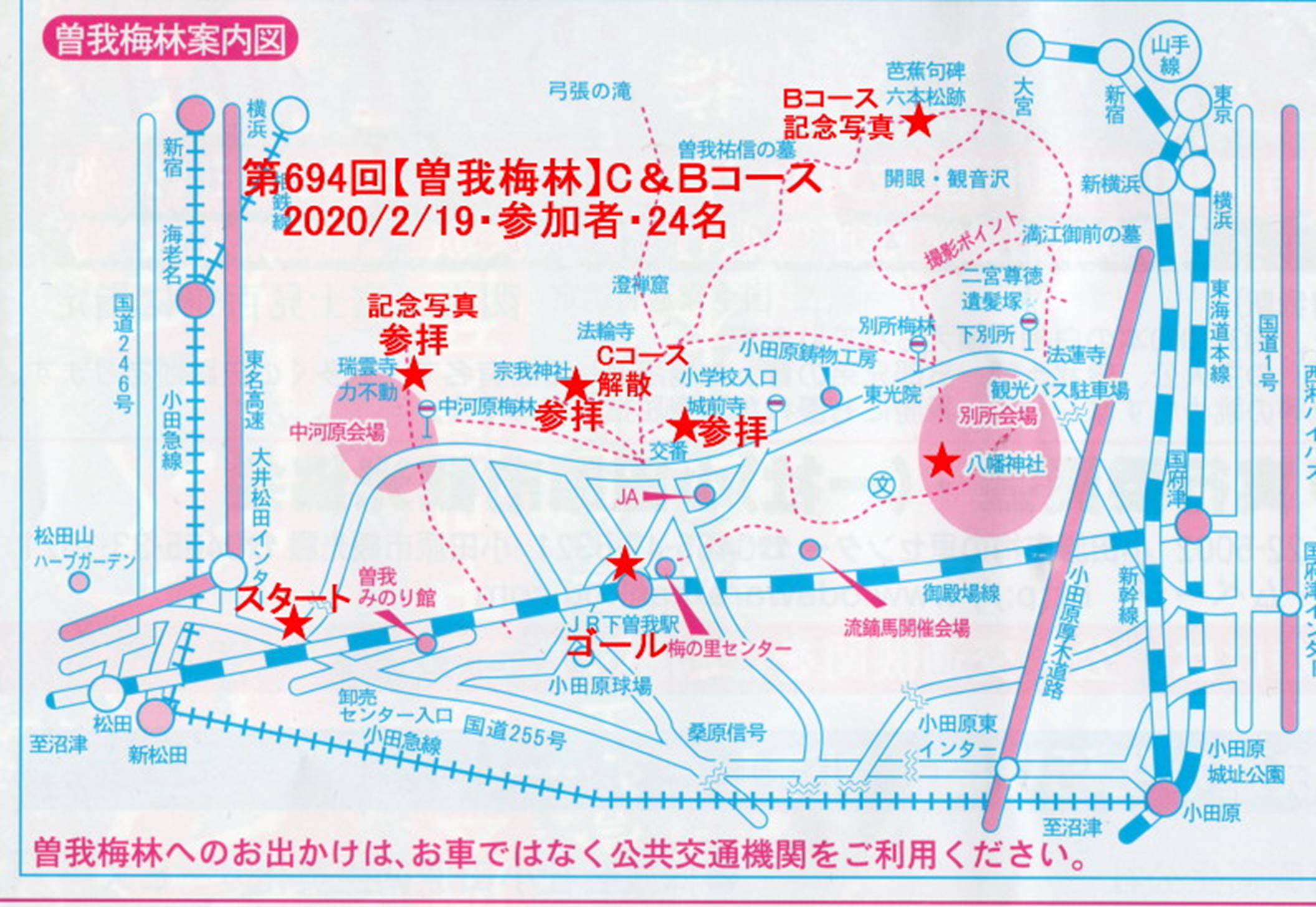 ◇催行日 令和2年2月19日(水) 天気・晴れ ◇コース 小田急新松田駅10時集合 新松田駅(バス10時25分発)→(バス20分)中原梅林→瑞雲寺→宗我神社→城前寺 →(Cコース解散)→六本松跡→見晴台→別所梅林→JR下曽我駅 |