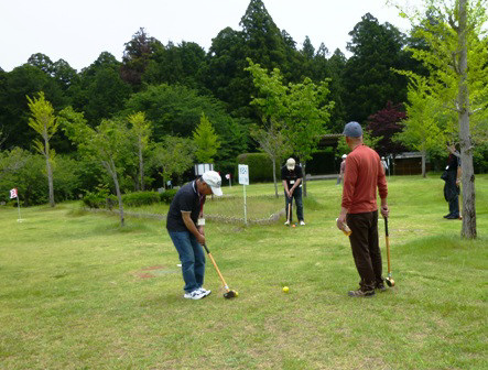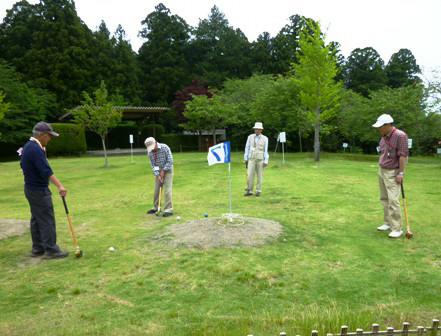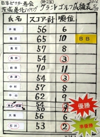 日 時:平成28年5月28日(土) 参加者:12名(県北メンバー11名+ゲスト1名) コース: 水郡線・静駅 → 静神社(参拝) → 静峰ふるさと公園 → グラウンドゴルフ → (昼食・歓談→)静駅 <全行程5km(ゴルフも含む)> 水戸駅に9時10分に集合、水郡線の静駅で下車して9時50分にスタート。途中の静神社で参拝、公園に到着すると先発の石川さんや直行3名も合流し全員揃いました。 11時前、石川さんからルール説明後、3グループに分かれて2コース全16ホールの合計点を競って早速プレー開始。初めてのコースで苦戦するホールもありましたが、全員昼食前に終了しました。 12時30分、昼食は簡単メニューで事務所内のテーブルに短時間でセットし、ビールで乾杯!はじめに石川さんから成績発表と上位入賞表彰があり、今回は1位;西郷、2位;石川、3位;青木(同点で高田、赤津)とハイキング幹事が独占し、大ブーイングでしたがスコアシートを第3者に厳しくチェック・・・で納得。 いつものように楽しい歓談が続き、ゲストの大坂さんからも近況報告などがありました。2時半過ぎに後片付けをして写真撮影後、公園を出発して往路を引き返しました。単線の水郡線は無人の静駅で40分以上も待ちましたが、予定の電車に乗車して4時半前、水戸駅で解散。薄雲りながら歩きやすい陽気のもとで、健康的な楽しい一日となりました。 |