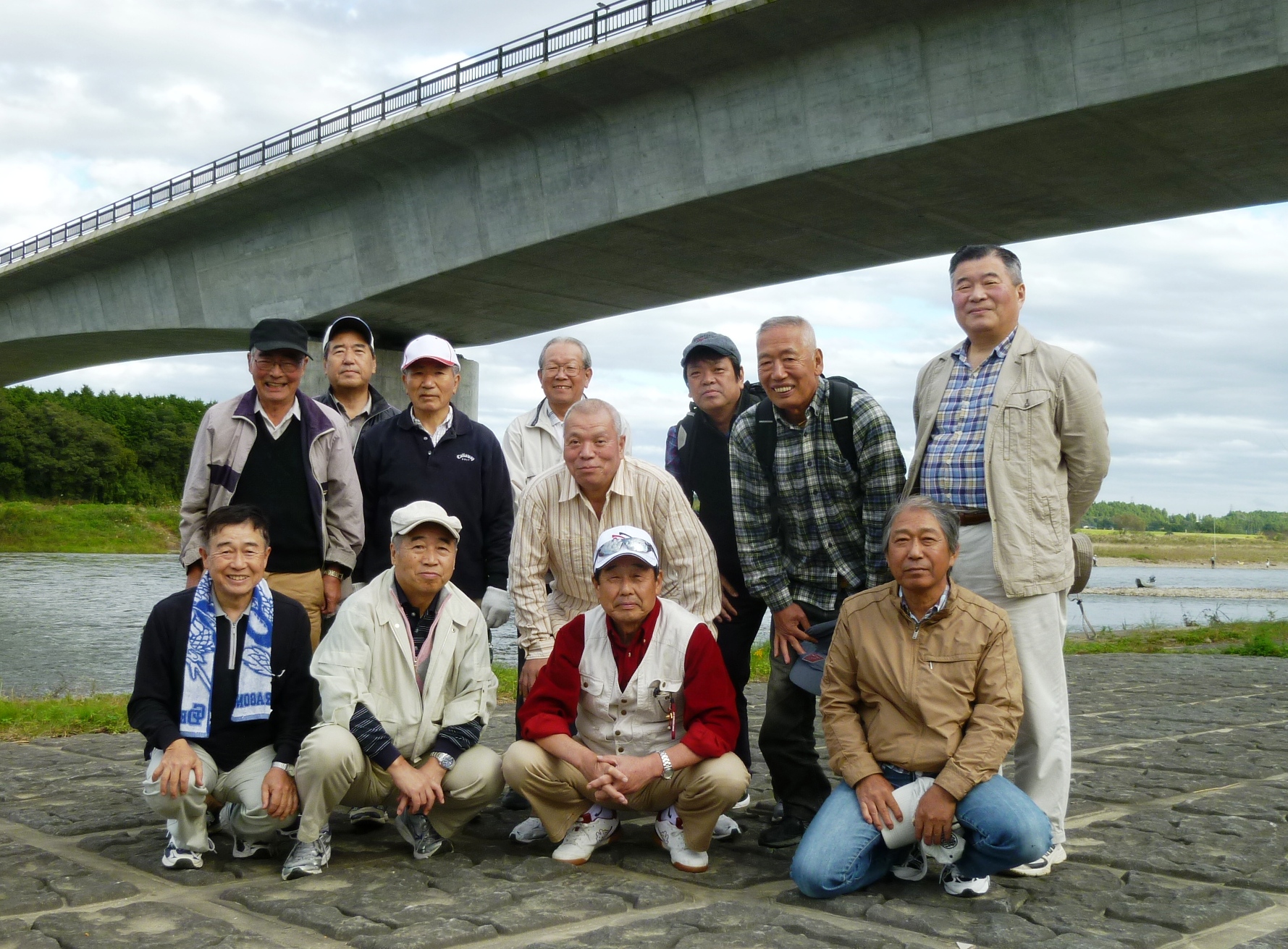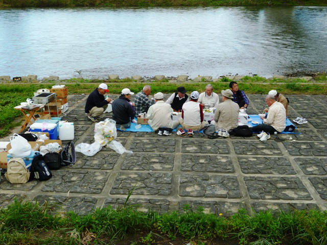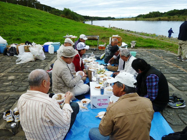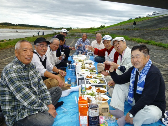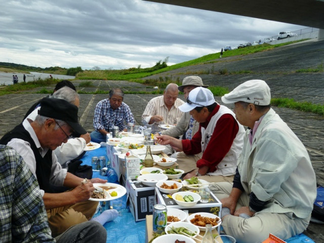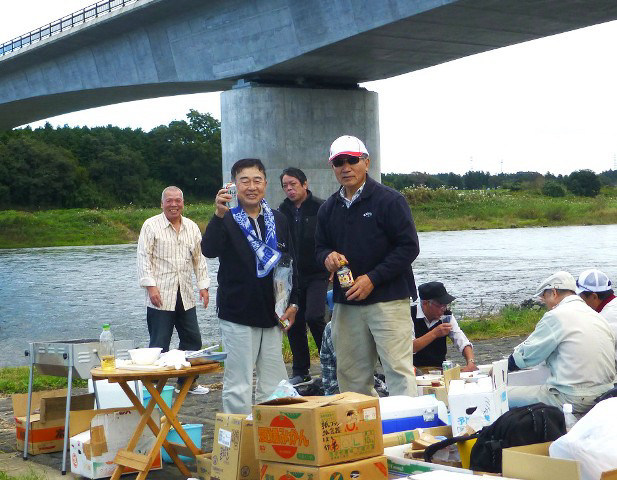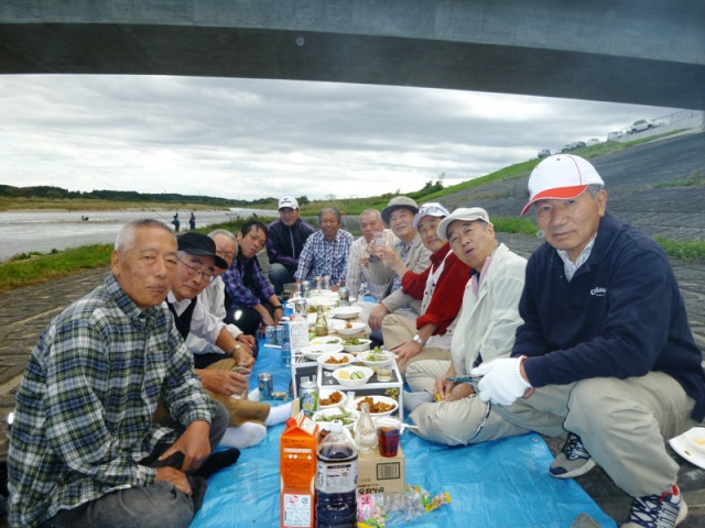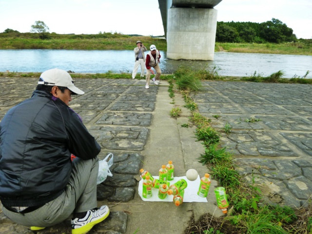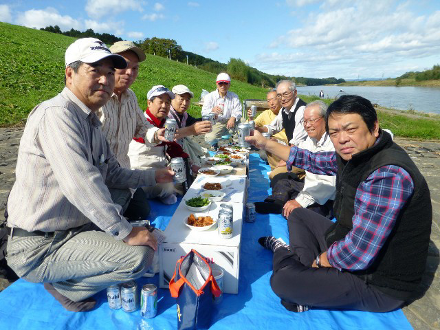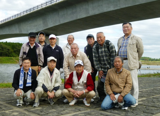 ■日 時:平成28年10月29日(土) ■参加者:12名(県北メンバー11名+ゲスト1名) ■コース:飯富町バス停「大橋場」 → 藤井川橋 → 那珂川堤防 → 那珂川西大橋 → BBQ会場(昼食・歓談)→ バス停「西田川」 <全行程4km> 今回は路線バスを利用して目的地より前で下車し、短い距離を歩くコース設定ながら、メインはBBQを楽しむという企画。前夜の雨も上がり好天のもと、水戸駅改札口に9時30分に集合したメンバーは北口から御前山方面行のバスに乗車。飯富町「大橋場」バス停から10時30分にスタート、交通安全のため脇道に回って那珂川を目指しました。 途中、水たまりが多い箇所もありましたが、予定通り11時には目的地の那珂川西大橋下のBBQ会場に到着、一部の直行組も既に到着しており、全員揃ってビールで乾杯!いつも通りBBQ・昼食担当(青木さん、西郷)はまだ献立準備中のため、時間調整で「ピンポン玉掴み取り」ゲームを行いました。 最初に出された那珂湊市場調達のマグロ刺身は瞬く間になくなり、段ボールテーブル上に並ぶツマミや焼き立て特大サンマなどで酒も進み、お互いの情報交換や昔話など和やかムードで大いに盛り上がりました。 午後は石川さん考案の「ソフトボーリング」ゲームで、倒れたペットボトルの数を競い合いましたが、酒の飲み過ぎからか?コントロールが乱れる場面もありました。豪華メニューの最後は厚切バラ肉入りのけんちん汁、さらに愛知・三河名産(元は長野県)の五平餅、デザートは次郎柿というフルコースで、皆さん満腹状態でした。 しばらく歓談の後、石川さんよりゲーム結果発表(2つのゲーム合計)が行われ、上位入賞は優勝・石川さん(幹事受賞で事前練習だとブーイング!)、準優勝・中山さん、3位・高田さんに賞品、BB・中村さん、BM・高石さん(先週のゴルフに続きBM定着?)他全員に参加賞が贈呈されました。午後2時半に後片付けとなり、器材運搬やゴミ分別は全員で行い、短時間で車に積み込み完了。 帰路は直近のバス停「西田川」まで歩き、水戸駅行きのバスに乗車、午後4時前に水戸駅で解散しました。次回は来年5月予定ですが、春のハイキングで好評だったグラウンドゴルフ付企画の要望もあり、幹事で検討することにしました。快晴の秋晴れとは言えなかったものの、食欲の秋を満喫した楽しい一日でした 。 |