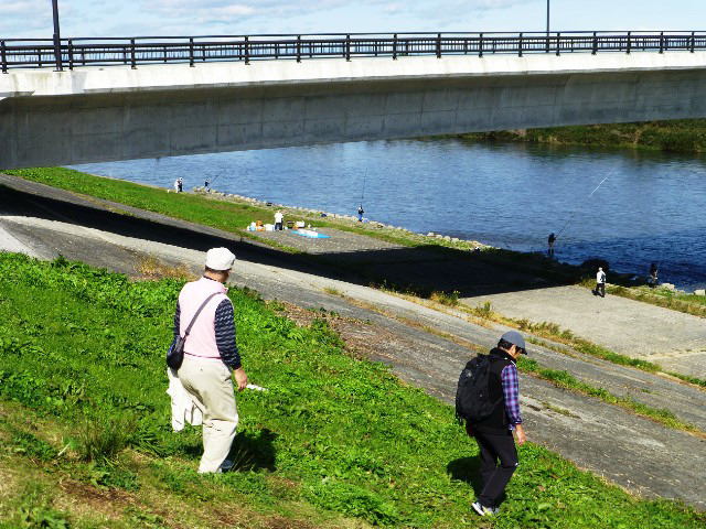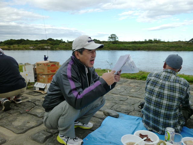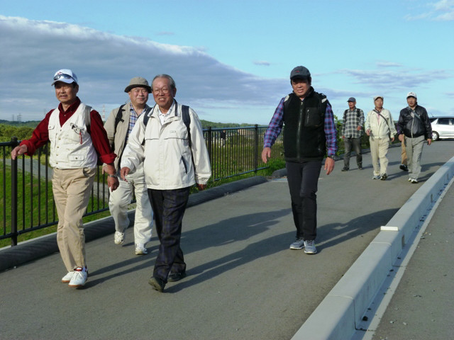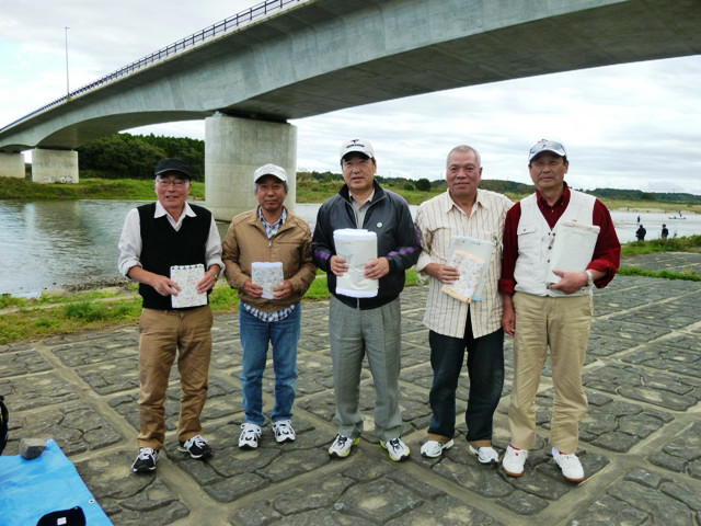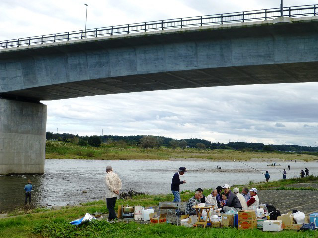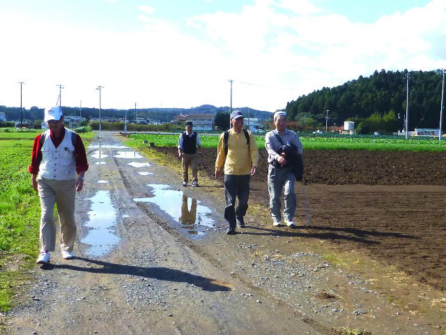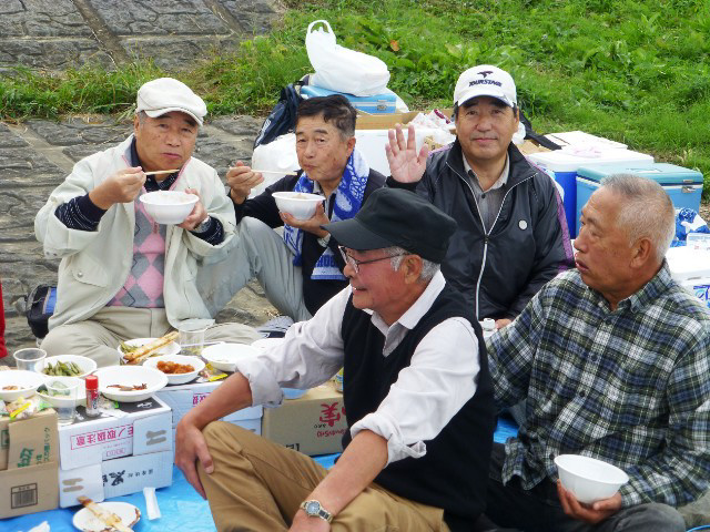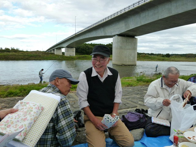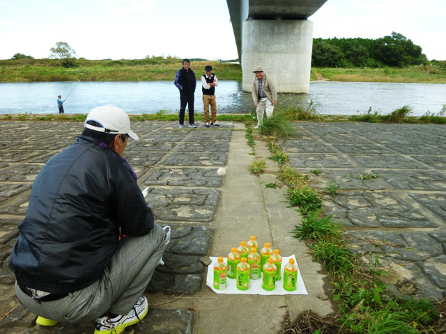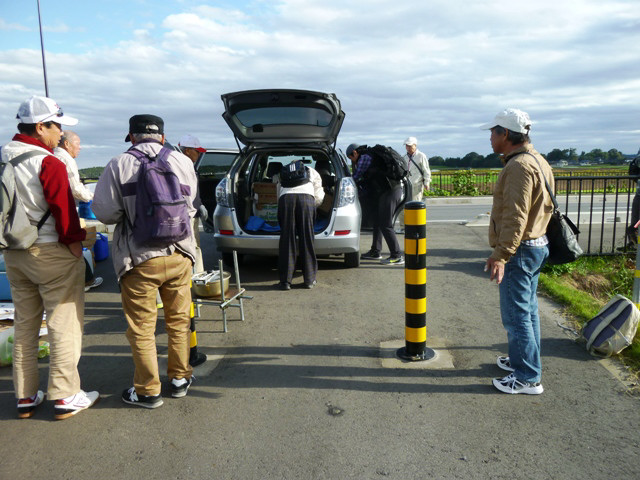 ■日 時:平成28年10月29日(土) ■参加者:12名(県北メンバー11名+ゲスト1名) ■コース:飯富町バス停「大橋場」 → 藤井川橋 → 那珂川堤防 → 那珂川西大橋 → BBQ会場(昼食・歓談)→ バス停「西田川」 <全行程4km> 今回は路線バスを利用して目的地より前で下車し、短い距離を歩くコース設定ながら、メインはBBQを楽しむという企画。前夜の雨も上がり好天のもと、水戸駅改札口に9時30分に集合したメンバーは北口から御前山方面行のバスに乗車。飯富町「大橋場」バス停から10時30分にスタート、交通安全のため脇道に回って那珂川を目指しました。 途中、水たまりが多い箇所もありましたが、予定通り11時には目的地の那珂川西大橋下のBBQ会場に到着、一部の直行組も既に到着しており、全員揃ってビールで乾杯!いつも通りBBQ・昼食担当(青木さん、西郷)はまだ献立準備中のため、時間調整で「ピンポン玉掴み取り」ゲームを行いました。 最初に出された那珂湊市場調達のマグロ刺身は瞬く間になくなり、段ボールテーブル上に並ぶツマミや焼き立て特大サンマなどで酒も進み、お互いの情報交換や昔話など和やかムードで大いに盛り上がりました。 午後は石川さん考案の「ソフトボーリング」ゲームで、倒れたペットボトルの数を競い合いましたが、酒の飲み過ぎからか?コントロールが乱れる場面もありました。豪華メニューの最後は厚切バラ肉入りのけんちん汁、さらに愛知・三河名産(元は長野県)の五平餅、デザートは次郎柿というフルコースで、皆さん満腹状態でした。 しばらく歓談の後、石川さんよりゲーム結果発表(2つのゲーム合計)が行われ、上位入賞は優勝・石川さん(幹事受賞で事前練習だとブーイング!)、準優勝・中山さん、3位・高田さんに賞品、BB・中村さん、BM・高石さん(先週のゴルフに続きBM定着?)他全員に参加賞が贈呈されました。午後2時半に後片付けとなり、器材運搬やゴミ分別は全員で行い、短時間で車に積み込み完了。 帰路は直近のバス停「西田川」まで歩き、水戸駅行きのバスに乗車、午後4時前に水戸駅で解散しました。次回は来年5月予定ですが、春のハイキングで好評だったグラウンドゴルフ付企画の要望もあり、幹事で検討することにしました。快晴の秋晴れとは言えなかったものの、食欲の秋を満喫した楽しい一日でした 。 |