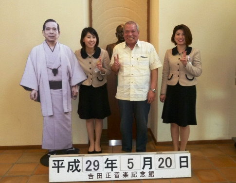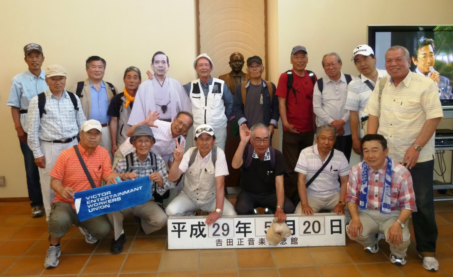 | (後列左から)赤津洋治、青木正彰、中谷陽一郎、遠藤 晃、(吉田先生パネル)、鳥養徳夫、(吉田先生胸像)、 鈴木 誠、前田 肇、三宅政康、石川徳治、中山周治(横のTV映像は鶴田浩二さん) (前列左から)鈴木武雄、井坂昌生、堀井信治、高田紀平、高石勝巳、中村幸男、西郷治男(敬称略) |
