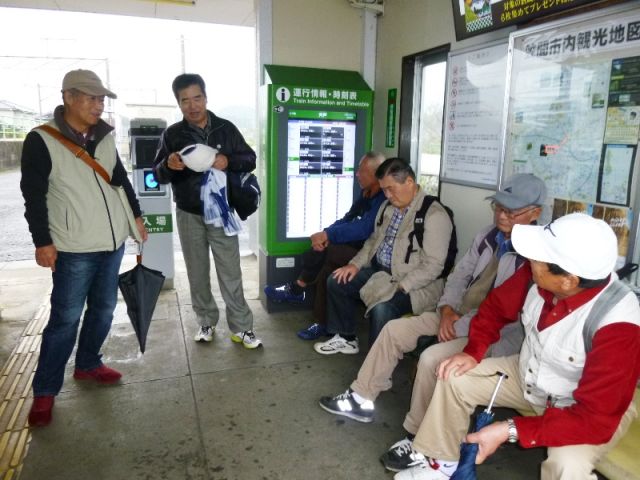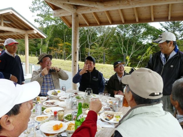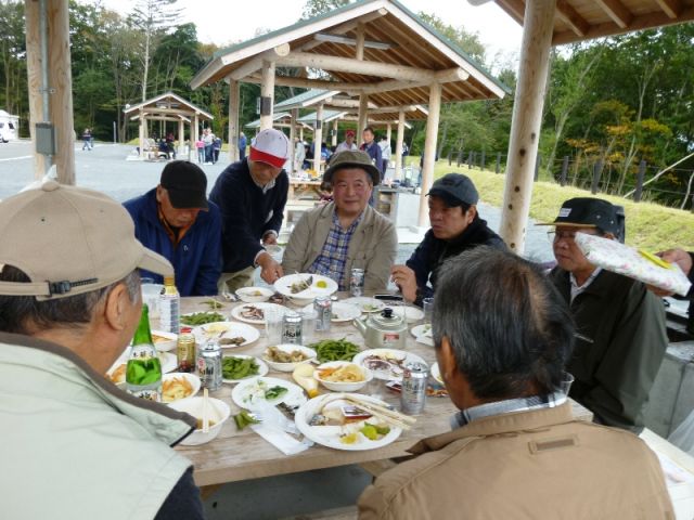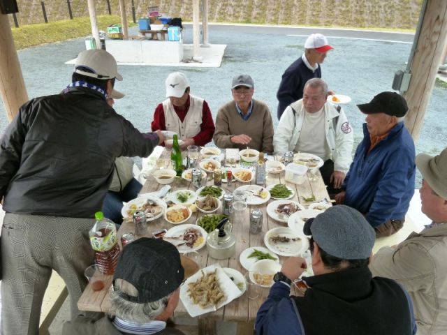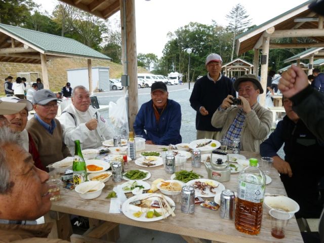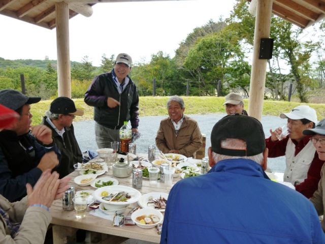 ◇日 時:平成29年10月28日(土) ◇コース:宍戸駅〜友部高校前〜北山公園・BBQ場(昼食)〜宍戸駅 <全5km> 前日までの好天から一変、当日は台風接近の影響から朝から曇りで午後から雨という予報のもとで、12名が参加しました。午前9時、水戸駅に集合したメンバー(2名は直行)は水戸線に乗車して宍戸駅で下車、10時に宍戸駅からスタート。友部高校前を過ぎると緩やかな上り坂となり、射撃場の横をさらに進むと、大きな新池と紅葉が色づき始めた景色が見え始めました。案内板を右折し、公園管理事務所前の坂道をまっすぐ進むと、今春リニューアルされたBBQ場に10時半過ぎ到着しました。 当初は昼食準備ができるまで園内散策の予定でしたが、午後の雨予報から散策をカットして全員がBBQ場で一休み。いつものように先発隊でBBQ準備中の青木さん・西郷の支度をみんなで手伝って、一足早く11時にビールで乾杯!秋のハイキングは青木シェフによるBBQが恒例となり、今回も豪華メニューが次々に登場しました。初めは枝豆、漬物、豊橋名産・ちくわ、一夜干しのイカ焼などで酒が進み、青木さんのアイデアによる酒の熱燗が出る頃には那珂湊市場調達の本マグロ刺身、続いて手作り地鶏の焼き鳥、メインディッシュは大根おろし付き大型サンマの塩焼、さらに豚バラ肉入り豚汁、最後はおにぎりで満腹となったところに、デザートは愛知産・次郎柿というフルコース。いつものように楽しい話題で大いに盛り上がりました。気になる隣のテーブルは女性が多数のJA釣りグループで、豚汁の残りものをプレゼントすると早速、揚げたてハゼの天ぷらのお返しを頂きました。 午後2時前、急いで後片づけの後、写真撮影はJAグループの一番若い女性にシャッターをお願いしたため、ニッコリと笑顔でハイ・チーズ!すぐあと「私達のシャッターは一番年寄りでお願い」と言われてしまいました。色々お世話になったJAグループの皆さんにお礼を言ってBBQ場を後にし、帰路の途中で雨が降り出したため急いで宍戸駅へ。水戸線は本数が少なく宍戸駅で40分ほど待って乗車、水戸駅で午後3時半過ぎに解散しました。今回は期待の紅葉はあまり楽しめず、帰路に予定の寺院や民俗資料館見学も出来ませんでしたが、急な山道もなく距離も短めで楽しいバーベキューの一日でした。 |