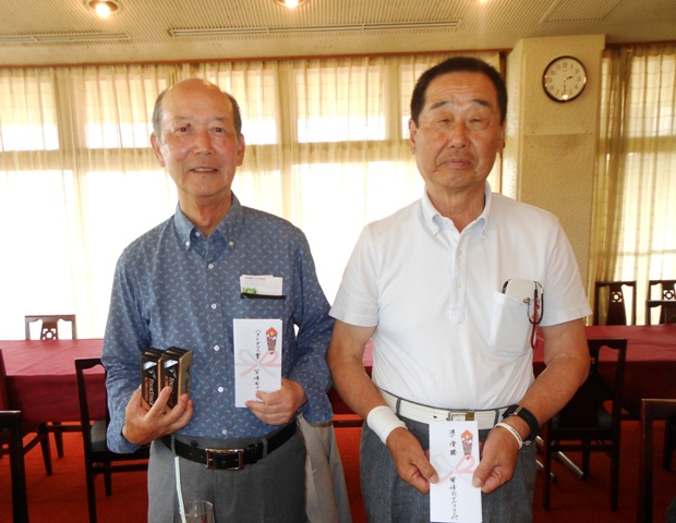 ≪紫峰会コンペ≫※当日参加:(県北)山口さん、石川さん ◇結 果:<敬称略> ・優 勝 鳥養 徳夫(G82 N76) ・ドラコン 高田 紀平、熊谷 盛 ・準優勝 高田 紀平(G82 N76) ・ニアピン 高田 紀平、桜井不二夫 ・3 位 西津 義弘(G107 N77) ・BB 権田 正敏 ・BM 石川 徳治 前日も本番も一時の雨予報を吹き飛ばして好天の青空のもとで4組で8時スタート、和やかなコンペが行われました。各ホールでは好プレーが展開されましたが、結果はコースを知り尽くし、イーグルも出した地元の鳥養さんが優勝、準優勝は僅かの差で高田さん、3位は県南の西津さんが食い込みました。パーティー・表彰式では来年も同じ内容で開催することを確認、日程は5/30-31と決めました。次回はもっと多くの皆さんが参加できるようにと願って散会しました。 |