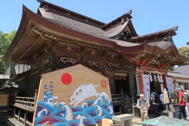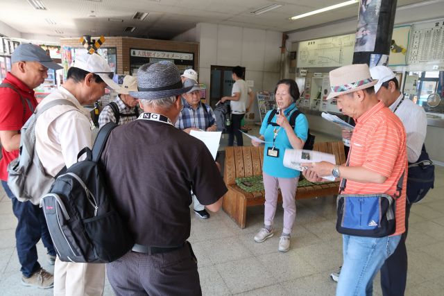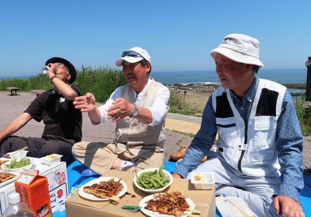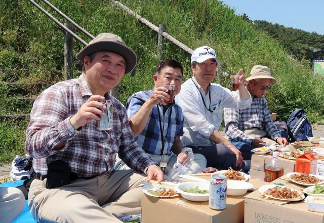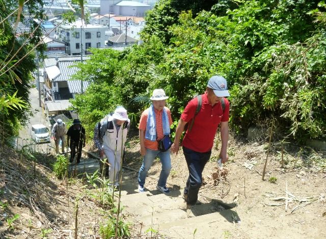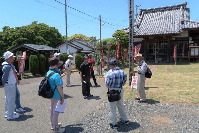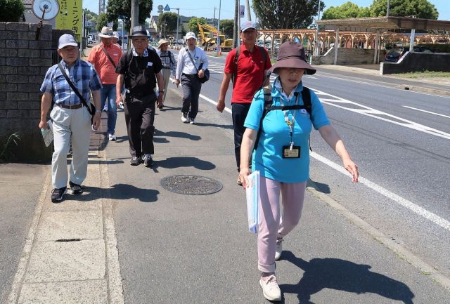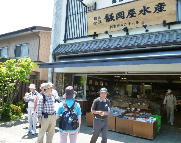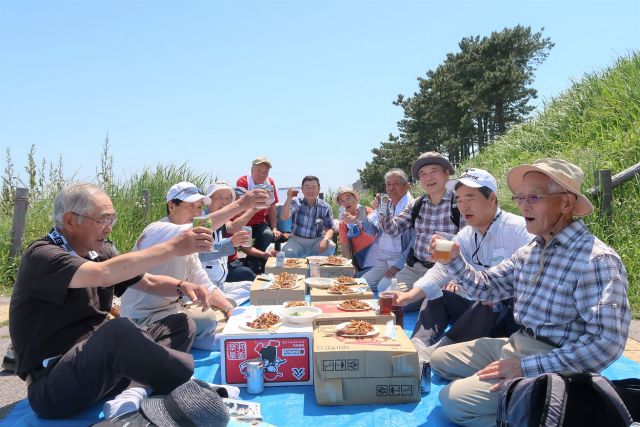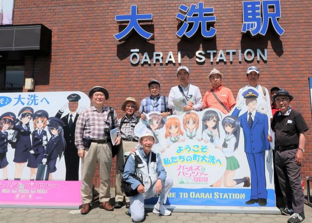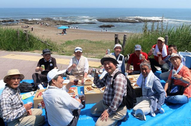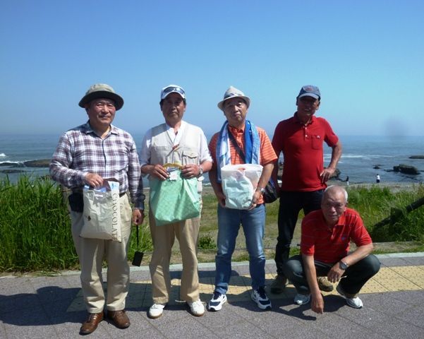 ◇日 時:令和元年5月25日(土) ◇参加者:11名(ゲストなし) ◇コース:大洗駅発 〜 水浜電車軌道跡 〜 須賀神社 〜 日下ケ塚古墳(海防陣屋跡) 〜 西福寺 〜 ワンコイン(かじま・飯岡屋・月の井酒造・吉田屋) 〜 養福院 〜 山村暮鳥旧宅跡 〜 大洗磯前神社 〜 昼食会場着(海岸駐車場脇)<全6km> ※帰路;周遊バスで大洗駅迄戻り 5年前に実施した大洗ワンコインツアー(1店100円の買物で飲食しながら大洗商店街を歩く)PartUで、今回の歩くコースはボランティアガイド(女性・深作さん)推薦の立ち寄リスポットを取り入れ、最後は新たな令和の時代が良き年となるようにと大洗磯前神社の見学・参拝を追加しました。 当日は30度を超える日差しのもと、午前9時に水戸駅改札口に集合した参加者は大洗駅でボランティアガイド(深作さん)からコース資料と説明を受けた後、元気よくスタート。はじめに昭和41年まで走っていた水浜電車(水戸と那珂湊を結ぶ路面電車)の軌道跡道路や市街地に残る車庫跡などを見ながら商店街へ。奥に鎮座する須賀神社や曲り松の説明を聞いた後、商店街裏から続く細く急な坂道(階段)を上ると古墳群の高台に到着。最も大きい日下ケ塚古墳(4世紀後半の前方後円墳、全長105m)を見学。江戸時代後期に沿海に接近する異国船の警戒のため古墳の一部を崩して作られたという海防陣屋跡も見学し、高台から市街や港などが一望できる場所でひと休みし、集合写真も撮影。 高台から下ると、皆さんお待ちかねのワンコインツアーで、最初の「かじま」;串揚げ、「飯岡屋」;さきいか等のツマミ、「月の井」;大吟醸試飲(酒がダメな人はサイダー)、「吉田屋」;ウメジュースなどを楽しみました。次にまた高台に上り、養福院千手観音堂を見学後、細い路地を下って詩人・山村暮鳥旧宅跡(記念碑)を見学。最後は大洗磯前神社へと進み、拝殿や本殿の説明を聞いて各自参拝しました。次に石段を下り、神磯の鳥居を見ながら海岸線を歩き、12時半過ぎに昼食会場へ到着。 既に西郷と直行組・中山さんと中村さんが昼食の準備を進め、ボランティアガイド・深作さんへお礼を込めて全員で乾杯!好天で日差しが強いブルーシート上の昼食ながら、さわやかな海風を受けて(個人別)刺身盛り合わせでビールや酒も一層進みました。楽しく歓談しながら、途中で石川さん考案「手投げバトミントンダーツ」を順番に行い、上位5名に賞品を贈呈。午後2時半過ぎ、全員で後片付け後、帰路は徒歩パスで巡回バスで大洗駅へ戻って、午後4時に水戸駅改札口で解散しました。 |