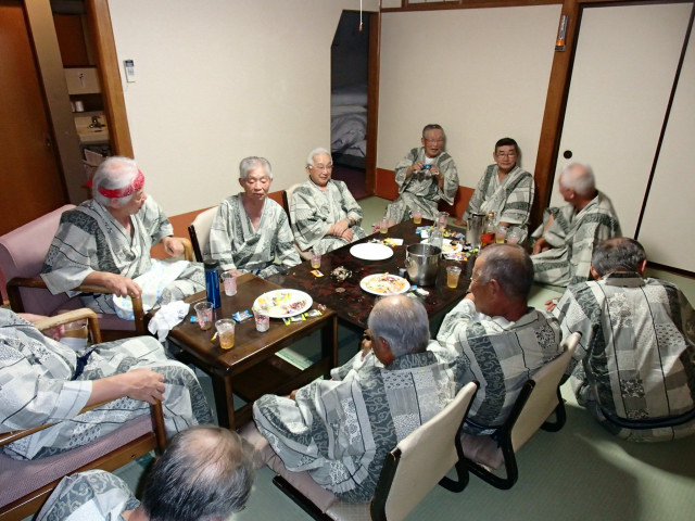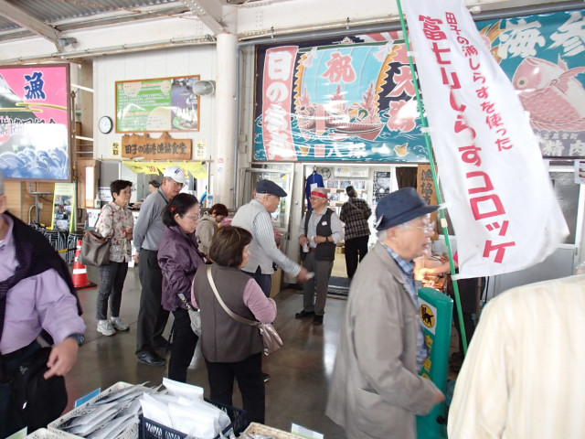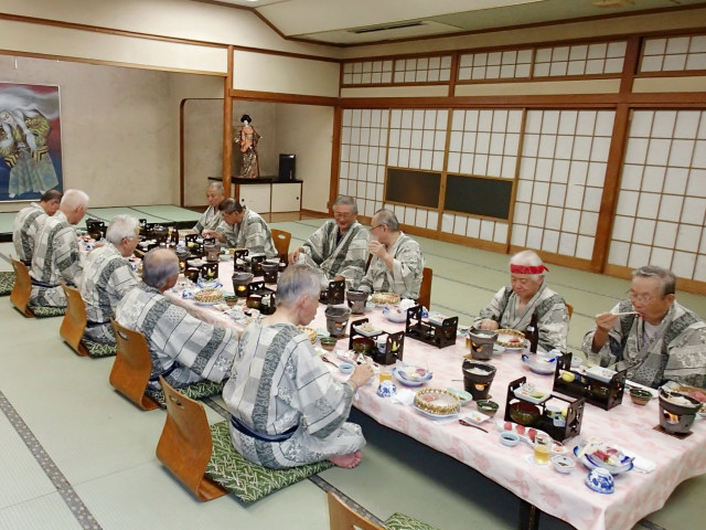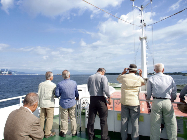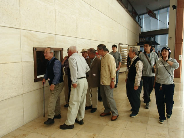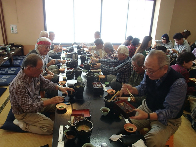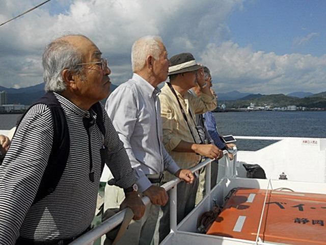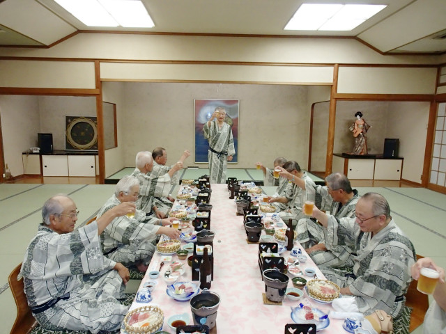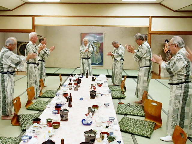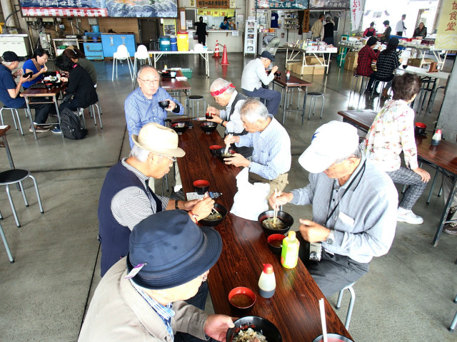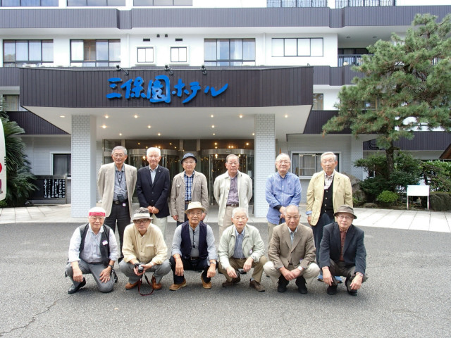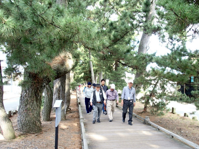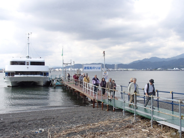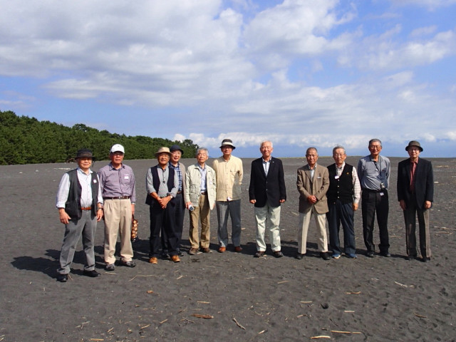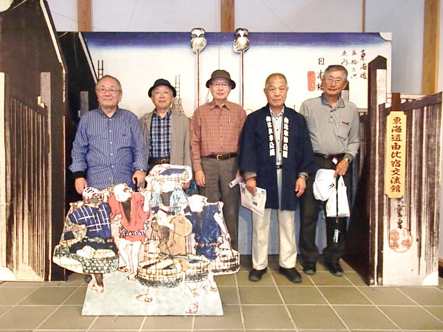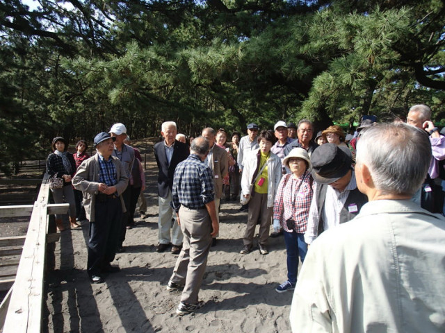 その後、今夜の宿泊地である、はごろも温泉・三保園ホテルへ。早速、温泉で疲れを癒し一息。18時からの宴会では、大西支部長のご挨拶、谷口さんの乾杯の音頭で待ちに待った宴会がスタート。まぐろ尽くしの会席料理と桜えびのから揚げを堪能し、昔話の花も咲き、皆さん大満足のご様子でした。 塚原さんの音頭で中締めののち、幹事部屋で二次会。全員参加で大いに盛り上がり、サークル活動の今後について、年一回の旅行を継続することや、内容の見直しを話し合い、一日目が終わりました。 【2日目】ホテル → 三保松原 → 清水港ミニクルーズ → 田子の浦 → 由比 → 大阪 はじめにホテルから間近の三保松原へ。御穂神社から海岸へ樹齢200年ほどの松並木が500m続く木造り の参道を経て松林へ。ガイドの案内で羽衣の松(三代目)の説明を聞いたのち、海岸へ。残念ながら、富士山は雲に覆われ、その雄姿を仰ぎ見ることはできなかったが、白砂青松の雄大な絶景を満喫し、清水港へ移動。 日の出桟橋からベイプロムナード号≠ノ乗船し、駿河湾のミニクルーズを楽しんだ。下船後、鮮度抜群で生食に適した、しらすが水揚げされる田子の浦漁港へ。早速、漁港食堂にて珍しい生しらす丼≠フ昼食と、名物のしらすコロッケ≠味わう。その後、最後の観光地由比へ。 ゆい桜えび館≠ノて名物の生桜えび≠試食したのち、各自で由比宿を散策。広重・正雪ゆかりの地に歴史を垣間見、由比を後にした。帰路は新東名を経由し、三ヶ日ICから往路を引き返し、大阪に無事到着した。今回は、日頃味わうことのない、生しらすや生桜えびなどの珍味に加え、静岡が誇るうまいものを賞味し、銘菓・銘茶の製造工場も見学、試食・試飲もでき、グルメ&社会見学的な、何時もとは趣の異なる旅となりました。 ◇参加者(敬称略・50音順) 跡見勝彦、上原 茂、大西憲嗣、尾崎孝介、谷口公玄、塚原義弘、野澤 隆、前田康三、 増村正博、宮本賢治、森江 毅、堀伊佐夫。 ↓画像下の矢印ボタンで、スナップ写真29枚を手動切り替えで、ご覧頂だけます。↓