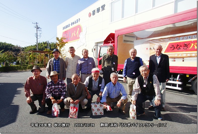〜清水港ミニクルーズと世界遺産・三保の松原、 静岡うまいものめぐりの旅〜 旅行サークル担当 堀 伊佐夫 ◇実施日:平成28年10月26日(水)〜27日(木) ◇行程および内容 【1日目】大阪 → 浜松(昼食と浜松銘菓の工場見学)→ 牧之原(製茶工場の見学)→ 三保松原・三保園ホテル(泊) なんば・梅田から分乗した参加者12名は、新名神・伊勢湾岸・東名道路を経て一路浜松へ。