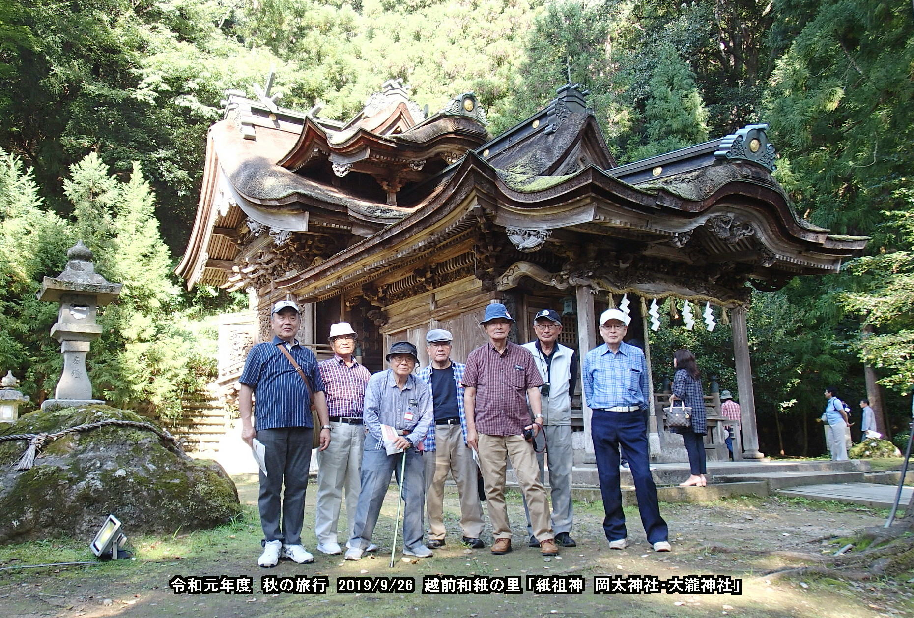 二日目は、山中温泉に立ち寄り、鶴仙渓・ゆげ街道を散策した後、越前和紙の里へ。1500年ほど前、この地に紙漉きの業を伝えた女神を紙祖の神として祀っている「紙祖神 岡太神社・大瀧神社」を拝観・参拝した後、「越前そばの里」で美味しいそばを試食し、帰路へ。