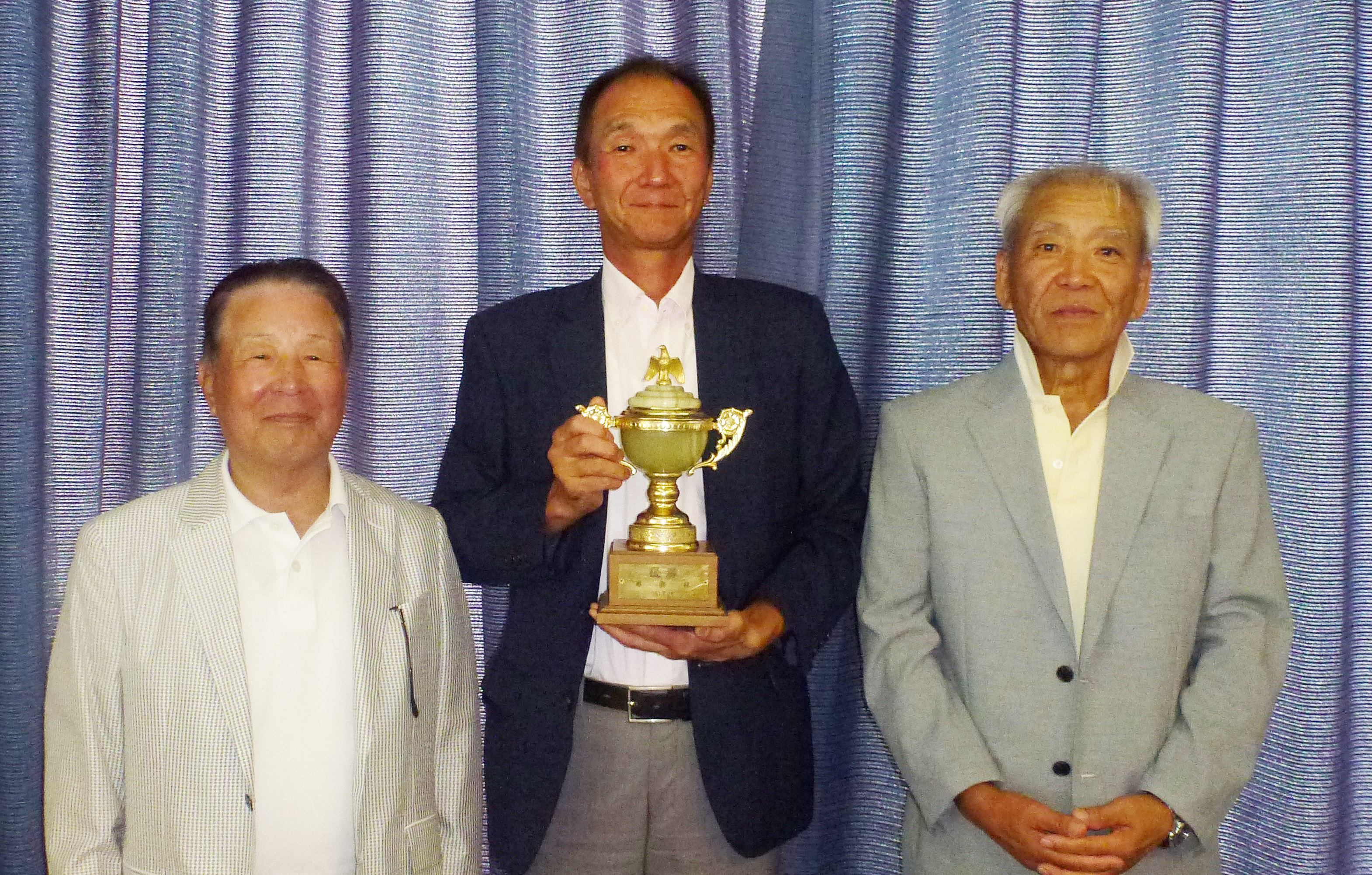 ビクター退職後このコースでの仕事を選択し、すべてを知りつくしたコース知識を十分発揮し、前々回に続き見事に優勝の栄冠獲得となった。 準優勝は、賛助会員の高田三ツ衛さん。年間60〜75ラウンドプレーのゴルフ生活を送っており安定したプレーでの入賞となった。(疲れを知らない体力、同年代の人からは羨ましい!!) 第3位は田頭光雄さん。調子が良ければNETアンダープレーも見られるが、今回は遠慮?したプレーで優勝に届かず残念ながら第3位に終わる。暑い中、全員リタイヤすることも無く終えられた事に感謝=======!! 次回、11月開催時は暑さの心配も無く好スコアーでの勝負を期待したい。