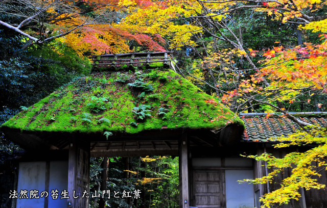 苔生した山門」の緑が、紅葉とマッチして、訪れた人は必ず写真を撮ります。ここは少し高台にあり、