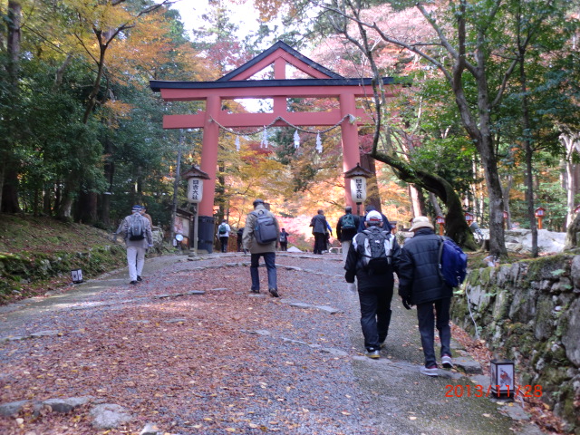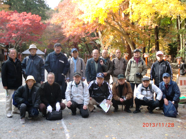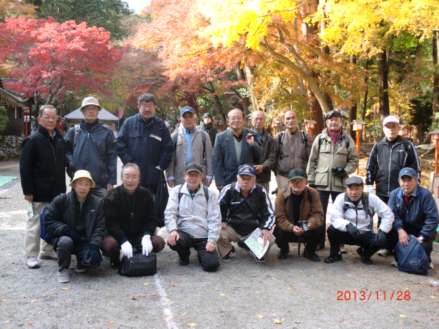後発組3名は日吉参道を「日吉大社」へ向かう。この参道の左右は真っ赤に色づいた紅葉が美しく、両端に並ぶ寺々は延暦寺の里坊である。「日吉大社」で合流。「山王鳥居」をくぐり「西本宮」を見学し、昼食、休憩。集合写真を撮り出発。