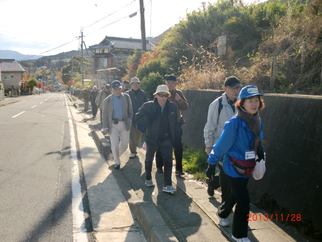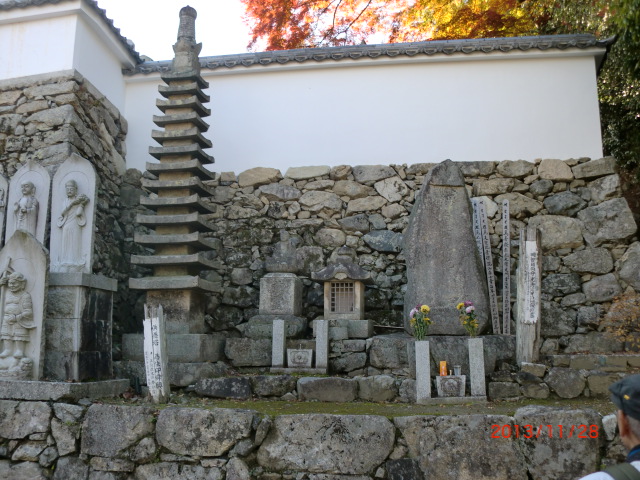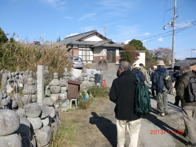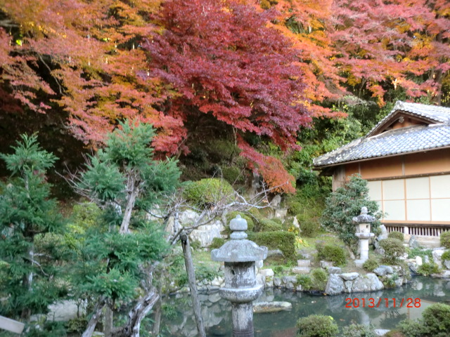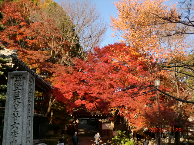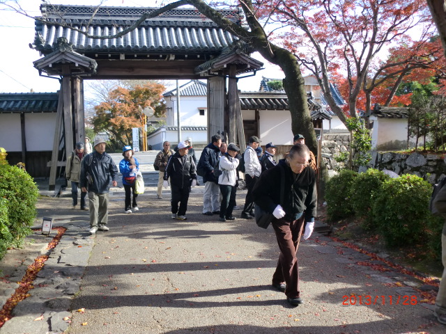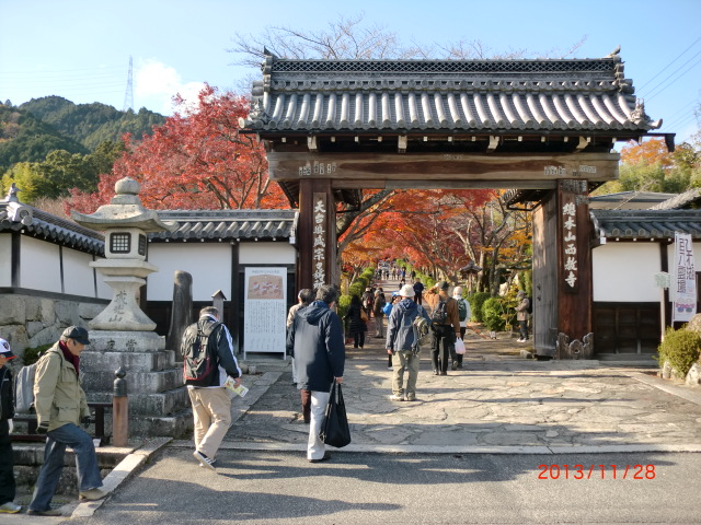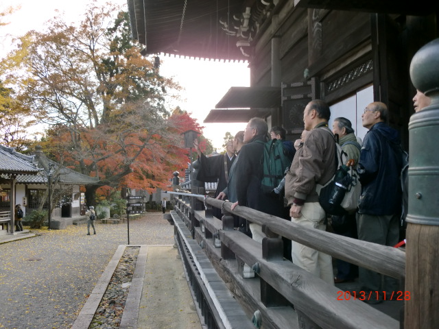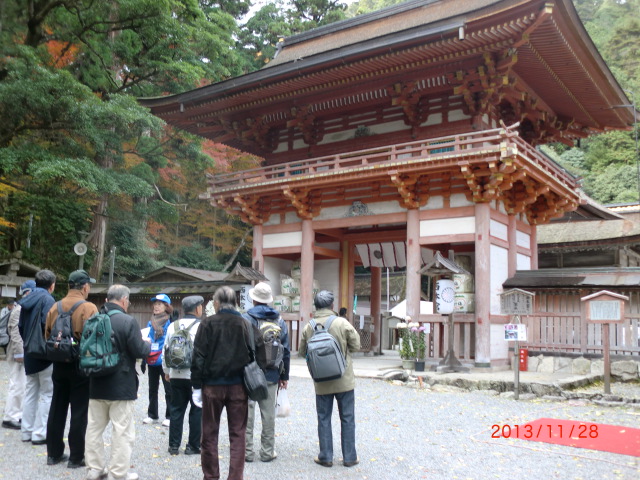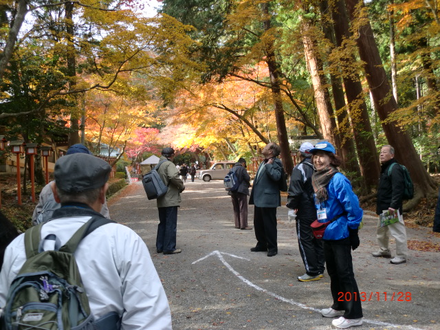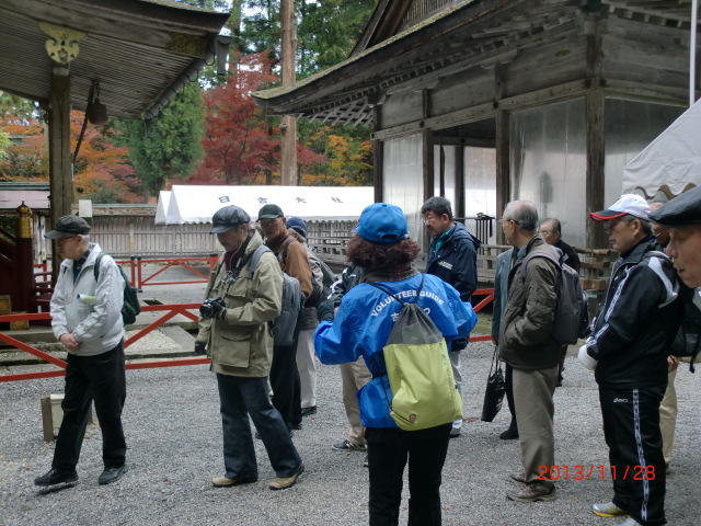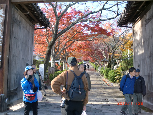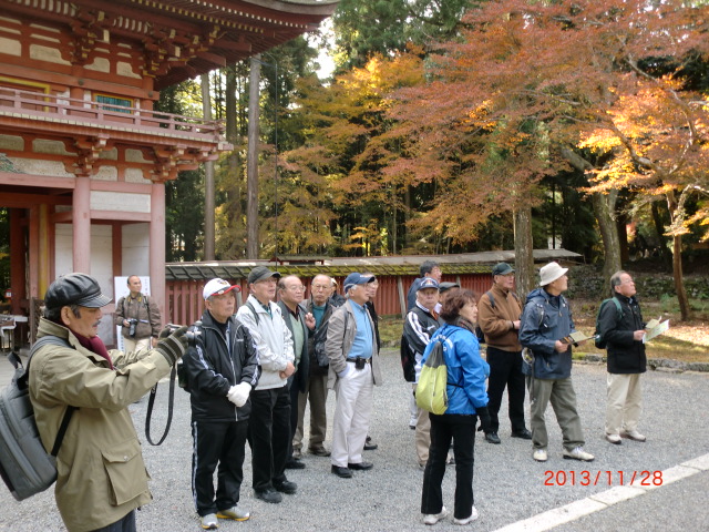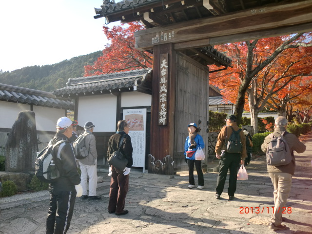 「東本宮」を見学。「日吉大社」を後にし「八講堂千体地蔵」を経由し琵琶湖が一望でき「西教寺」へ通じる「山の辺の道」を歩く。「西教寺」は紅葉の名所だけでなく「明智光秀」一族の墓所としても名高い。ガイドさんの計らいで住職さんの説明が受けられた。ここでも紅葉の美しさを満喫し、全員出発点のJR比叡山坂本駅に予定時刻に無事完歩。