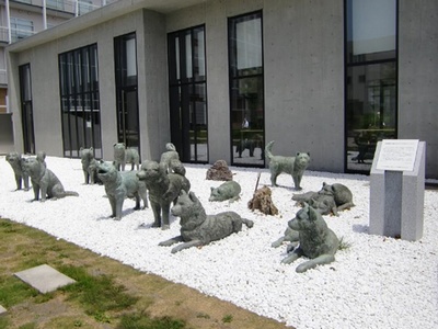 およそ1時間で館内の見学を終えて裏口を出てみると、かって昭和基地で越冬隊のために活躍した愛犬たちの石造が置かれていました。 この後は隣接する複数の国立研究機関が同居する大きなビルのロビーに移り、その一角で昼食タイムです。あらかじめ電話注文しておいた“仕出し弁当(インスタント味噌汁付きでC/P抜群!)”をそそくさと食べ、 同ビルに併設されている国文学研究資料館を見学することにしました。ここは、さまざまの和書 ( 奈良絵本・古今和歌集・源氏物語・・・の古文書)など奈良時代〜江戸時代のとても貴重な写本・版本の数々を見て 和書の基本知識に触れることができる、大変貴重な常設の展示資料館です。