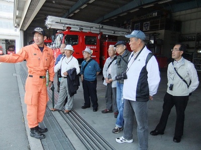 午後は立川防災基地に移動して、今回のメインプログラムである東京消防庁ハイパーレスキュー隊見学です。 見学の予約は午後1時から約50分間、“統括係の小薬(こぐすり)さん”に案内をしていただくことになりました。 最初に“第八機動隊の伊藤隊長”から、ご挨拶をいただいた後、「機動部隊の活動について」の映像」を視聴。この後、小薬さんの案内で訓練現場や施設(潜水訓練用のプール:口径7メートル、深さ22メートル)、 車庫内に置かれた消防・救護の特殊車両などの説明を受けました。 残念なことに大掛かりなレスキュー訓練や施設・装備品などは見られませんでしたが、中心的な訓練基地ということで域内の支部から車両・機材を持ち込んで行う 日常訓練や作業の風景を見ることはできました。 ハイパーレスキュー隊は消防隊と違い、「部隊のなかで任務を完遂できる自己完結型である」という使命を背負って活動しているそうで、 常に幅広い知識と能力を高める努力をしている姿に頭が下がります。東日本大震災・福島第一原発の被災現場での作業は命がけで対応した由だが、 使命感・責任感がすべてに優先しているのだと思います。 余談ですが、探究心旺盛なNさんから、「孫をレスキュー隊に 入隊させたいけど、待遇など は…?」と投げかけがあり、一生懸命に応じる小薬さんに一同が大笑いの一幕もありました。