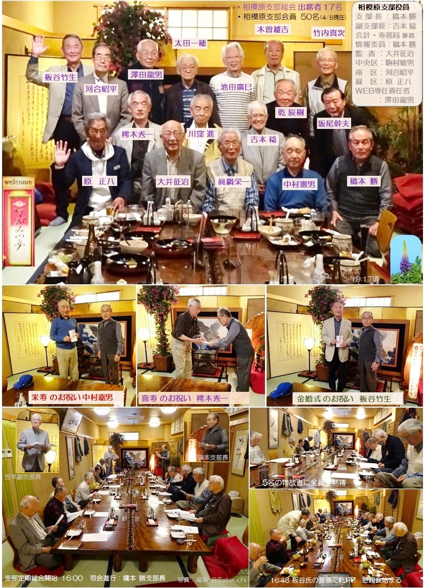 | 令和7年度の総会を5月2日(金) [鳥忠さがみの停]を会場に 会員17名が参加し開催しました。 開会に先立ち、物故者(*注)を偲び全員で黙祷を捧げました。 吉本副支部長の総合司会の中、橋本支部長挨拶に続き長寿祝い並びに金婚祝い者に記念品の贈呈がされました。 ◆総 会◆ 原 委員により 「規約に準じて会員の承認で「総会」が成立する」旨報告され議事に入りました。 議案 ![]() (1) 令和6年度事業報告 (2) 令和6年度決算報告・監査承認(大井監事) (3) 役員選任案 (4) 令和7年度事業計画案 (5) 令和7年度収支予算案 (6) 支部会則に関する報告並びに寿会活動今後2年間の取り組み案 議事に則り支部長より説明報告がされ審議の結果、 議案はすべて承認されました。 定刻終了後、記念撮影を終え閉会となりました。